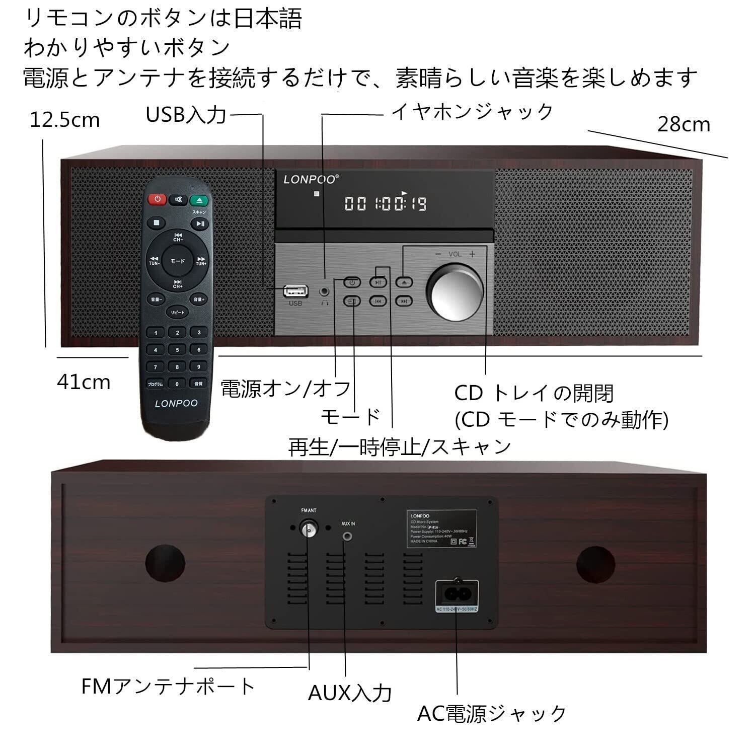 ボタンを押してCDトレイを開閉します。とても簡単で便利です。 フロント部分のLEDにより、CDのトラックと番号を簡単に確認できます。 リモコンは日本語で使いやすい、リモコンは離れた場所から操作でき、必要なすべての機能が含まれています。配線も、電源コードとFMアンテナを繋ぐだけ