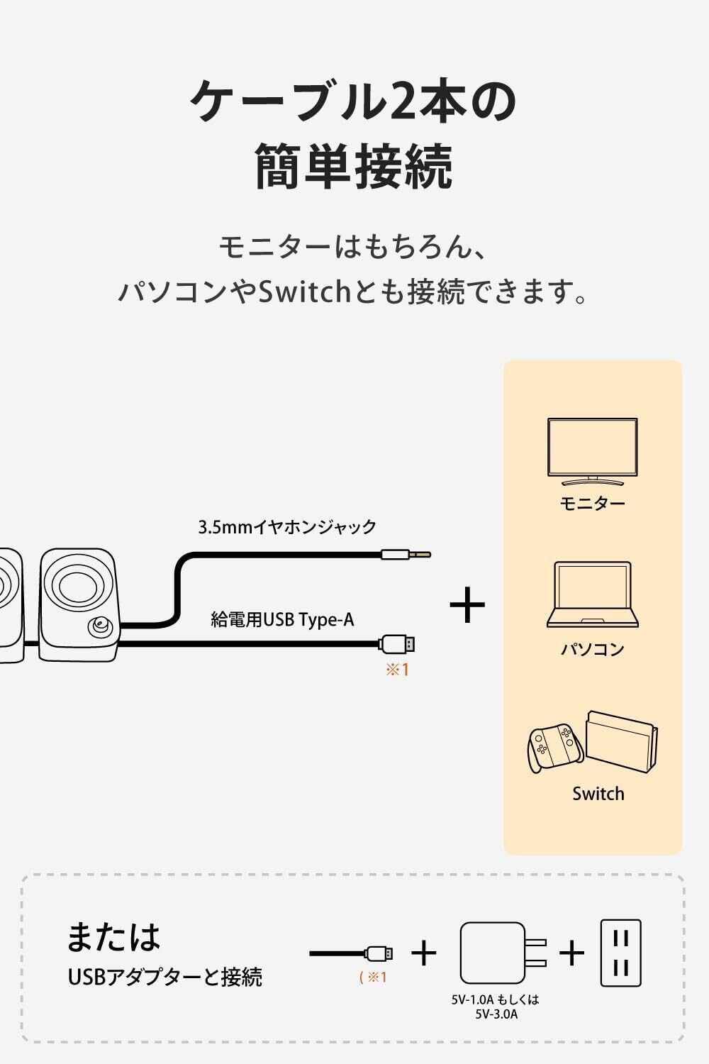【入力端子・接続方法 / 付属品】▼3.5mmAUXケーブル (130 cm) 、USB Type-A給電ケーブル (130 cm ) / ▼【付属品】取扱説明書(書付き)