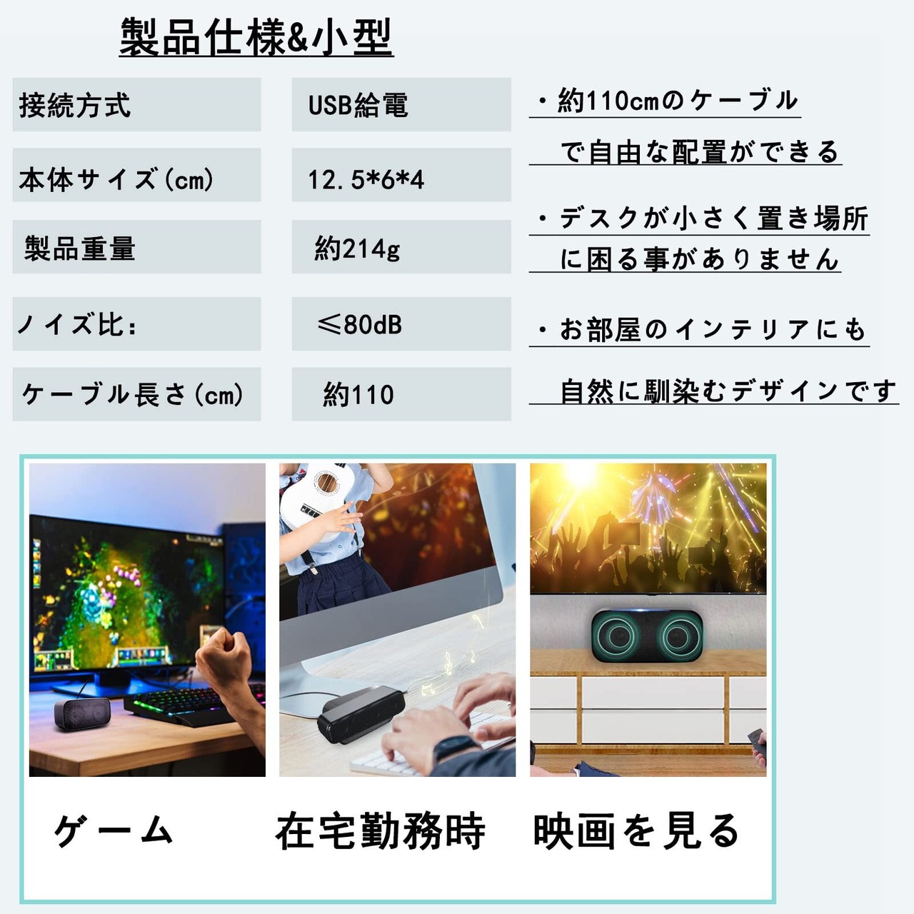 1.「なにも設定せず」3.5mmオーディオケーブルは必要がありません。USB端子はpcスピーカーに接続してボタンをクリックするだけでゲームや音楽を高音質で楽しめる。なにも設定が不要です。繋ぐ配線はパソコンのUSBで行えるためコンセントが不要で、パソコン周りの配線をスッキリさせられます。
