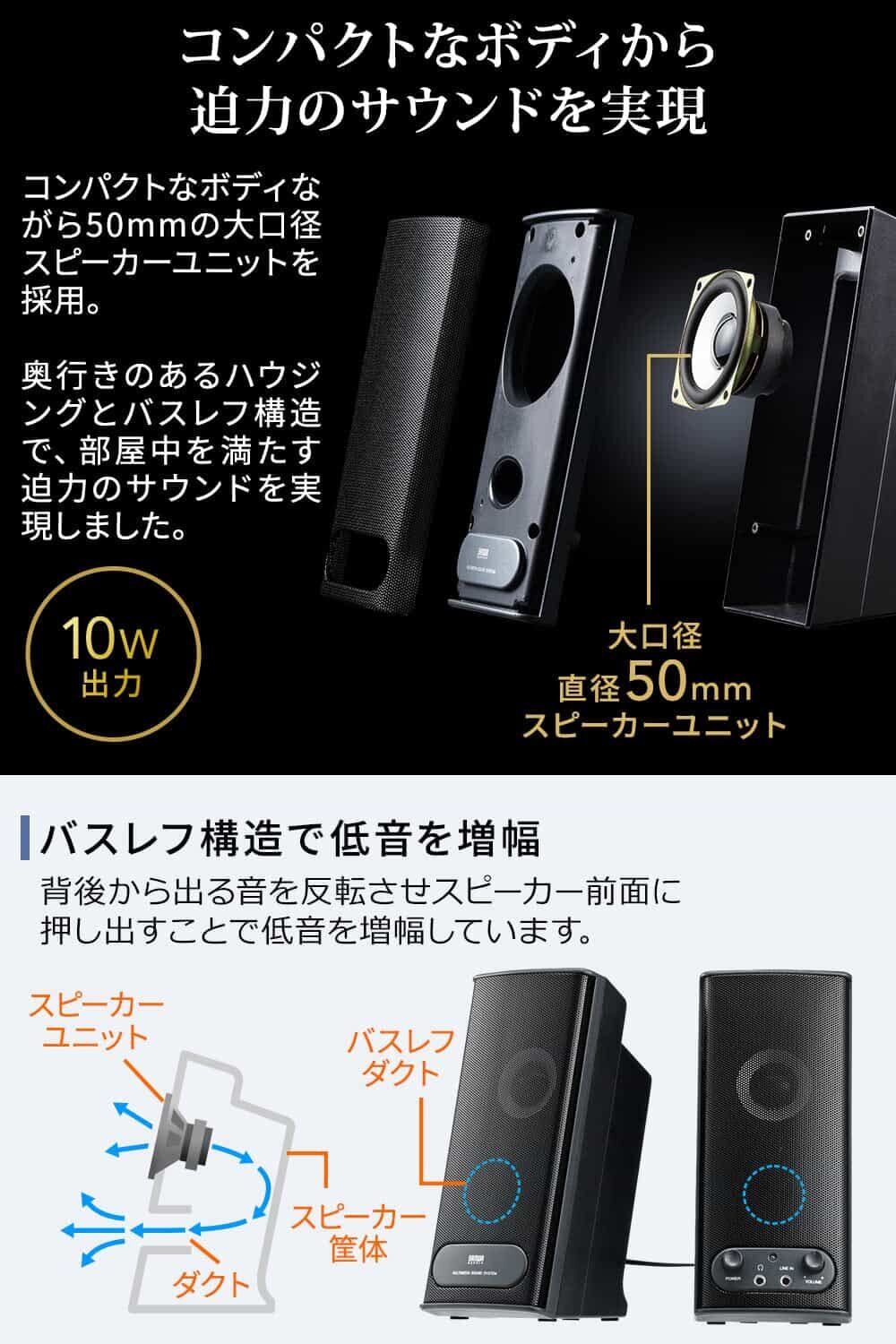 50mmの大口径スピーカーユニットを採用し、奥行きのあるハウジングとバスレフ構造で広がりのある音を再現できる2ch パソコンスピーカー です。 スピーカー の角度がやや上向きなるよう設計しているので、音が広がりやすくなっています。