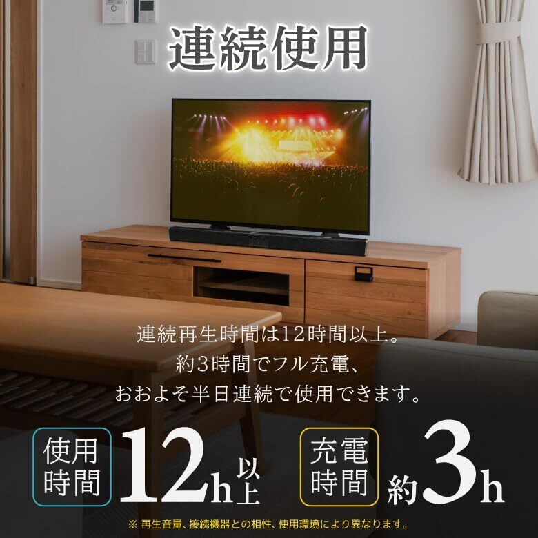 このサウンドバーは、有線接続は2種類から選択可能。一般的な AUX モードに加えてより良質な音声 音楽が再生可 能な COAX モード※2 を採用。連続使用時間は12時間以上。 約3時間でフル充電、おおよそ半日連続で使用できます。設置方法は、置くだけの床置きと背面のフック穴を使用した壁掛け設置が可能。