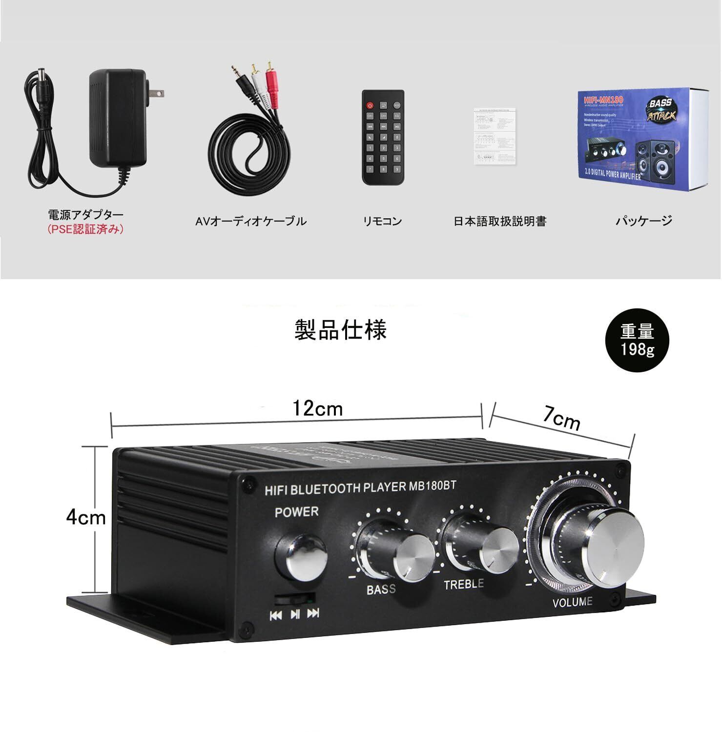 【コンパクトで軽量】横12cmx幅7cmx 高さ4cm 重量:198g 小型で軽いから、扱いやすいです。パッケージ内容:パワーアンプx1、AVオーディオケーブルx1、12V/3A電源ACアダプタ(PSE認証済み)x1、リモコンx1、日本語説明書x1