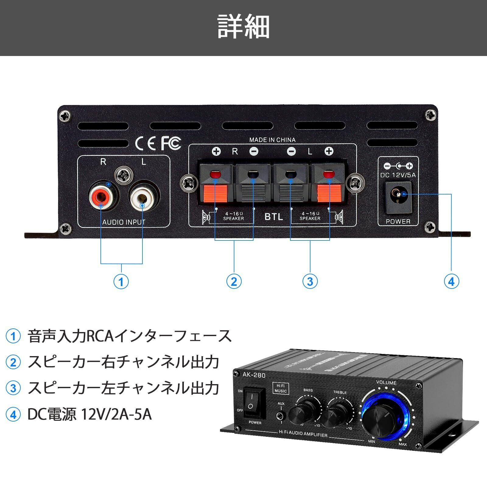 多様なスピーカー互換性: 4-8オームのスピーカーに対応し、高品質なサウンドシステムとの広範な互換性を。