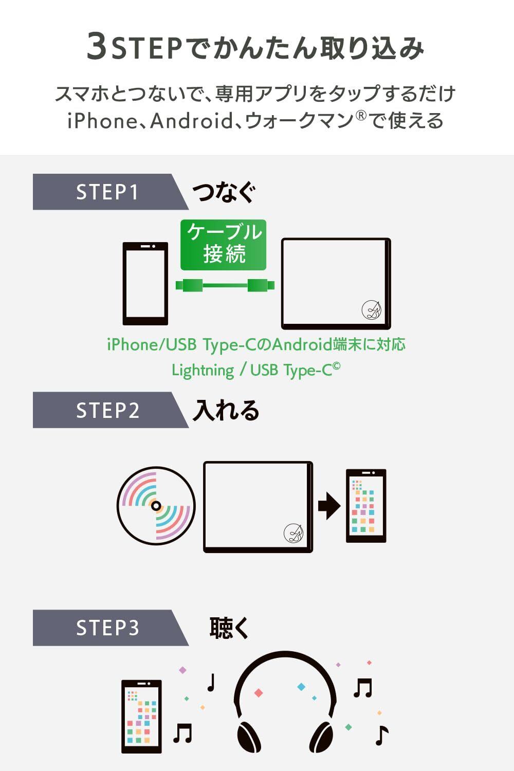 【パソコンなしでCDをスマホに入れて聴くCDレコーダー】「CDレコSE」は、お気に入りの音楽CDをスマホに入れて聴けるスマホ用CDレコーダーです。CDレコSEは、スマホとケーブルで接続します。専用のアプリ「CDレコミュージック」をインストールし、カンタンな操作でCDを取り込めます。