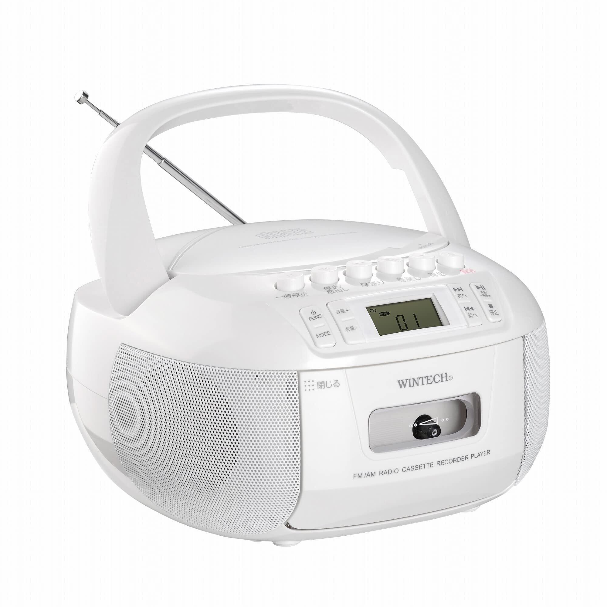 WINTECH【CDラジカセ】CDR-YS1 ホワイト シンプル&コンパクト AM/FM(ワイドFM対応)デジタルチューニング 外部入力端子 電源ケーブル付属 単二乾電池×6本(別売)
