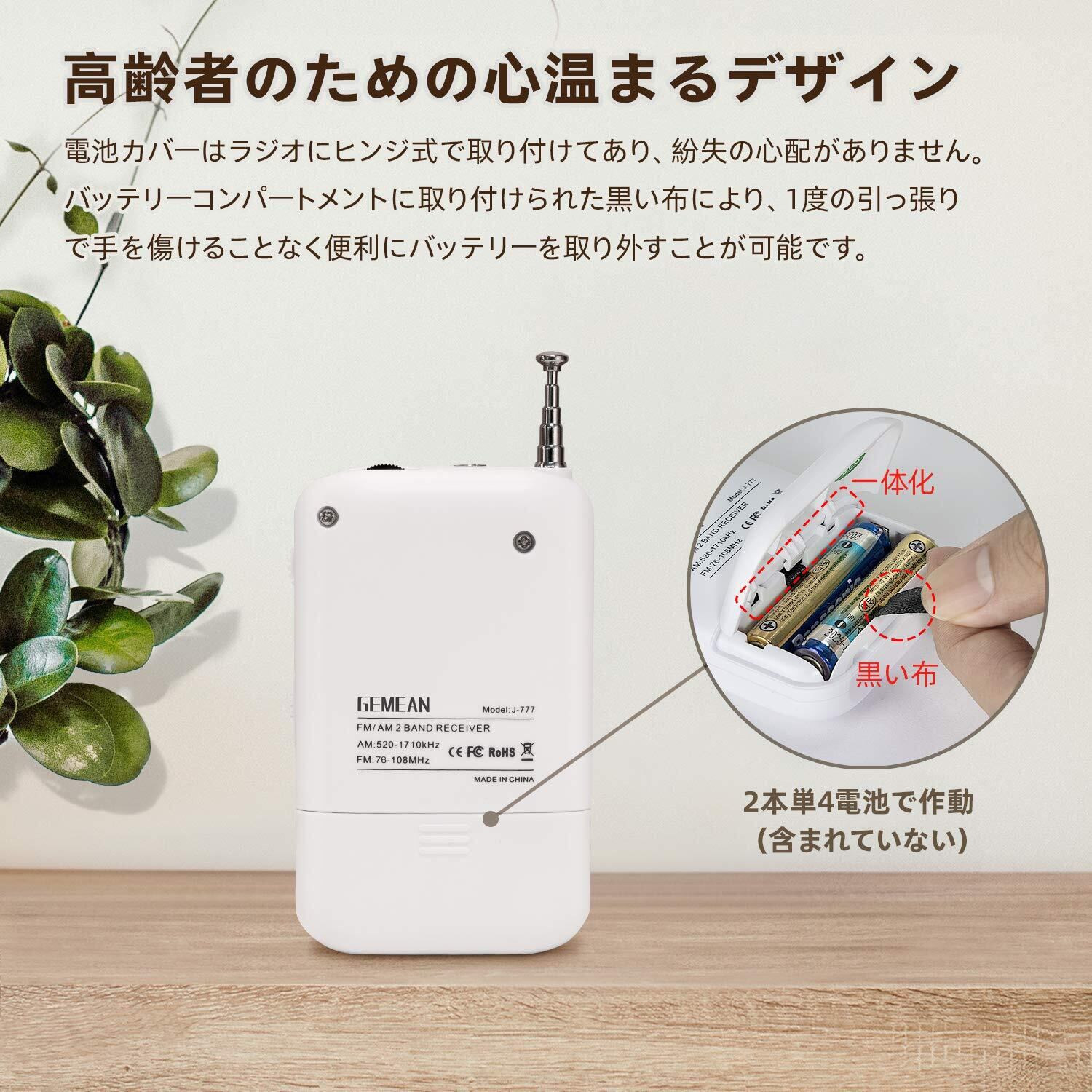 電池式ラジオ:バッテリー駆動の携帯式ラジオで、停電の場合でも外界と接続できます。単4乾電池2本を使用しています(含まれていません)。 バッテリーコンパートメントカバーはヒンジで固定されており、紛失する心配はありません。(注:主電源またはバッテリー充電は対応していません。)