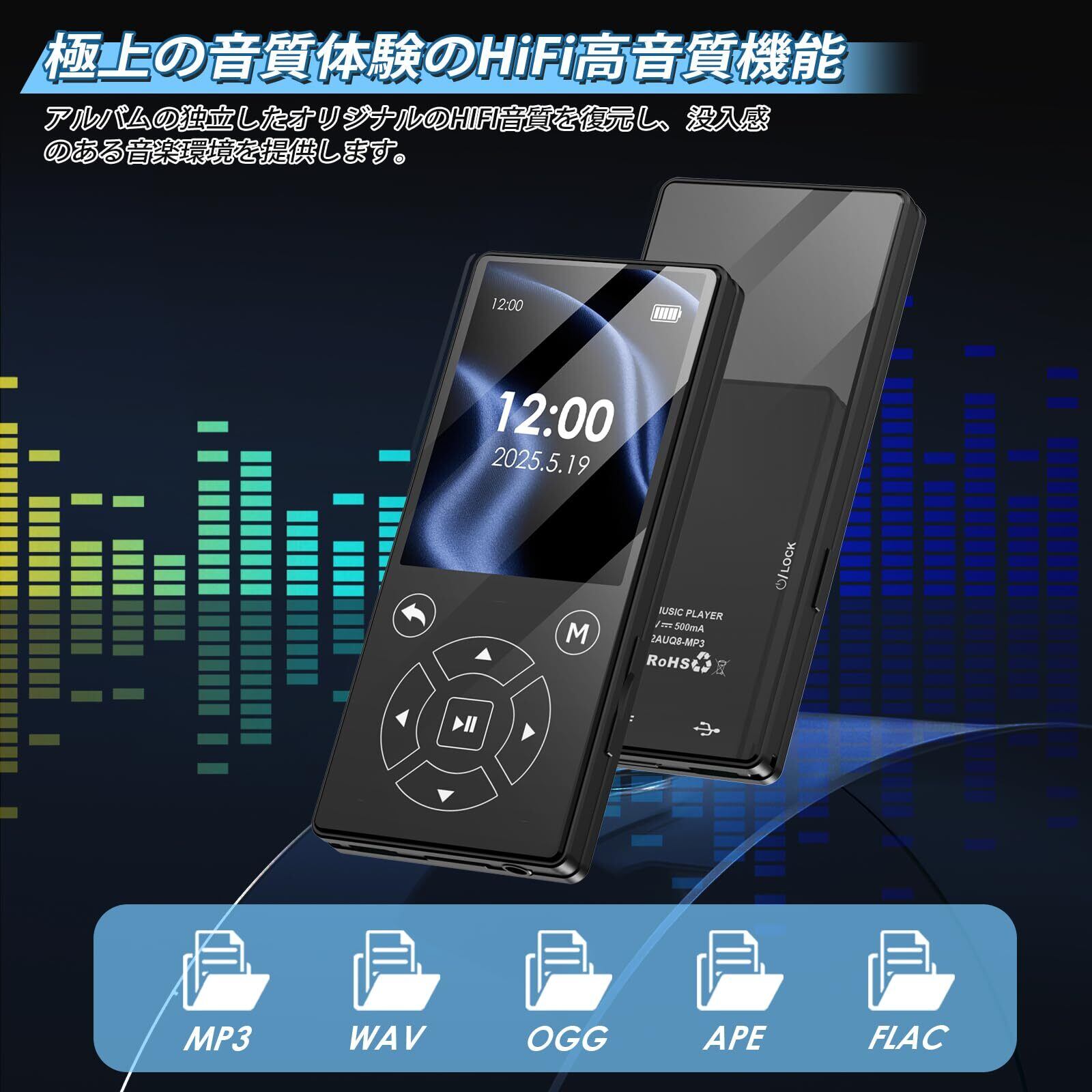 【音楽から防災まで!多機能MP3プレーヤー】単なる音楽再生だけでなく、日常生活から緊急時まで幅広く活用いただける優れものです。また、写真・電子書籍閲覧やビデオ、目覚時計など多彩な機能も搭載しております。さらに、語学学習に便利なA-Bリピートや倍速再生機能、ビジネスパーソンには会議録音機能が大変便利です。災害時にも安心のFMラジオ受信機能を備え、緊急時の情報収集にもご利用いただけます。1台で多彩な機能を楽しめます。※MP3/WMA/APE/FLAC/WAV/OGG(20kbps~499kbpsのファイルのみサポート)などに対応できます。