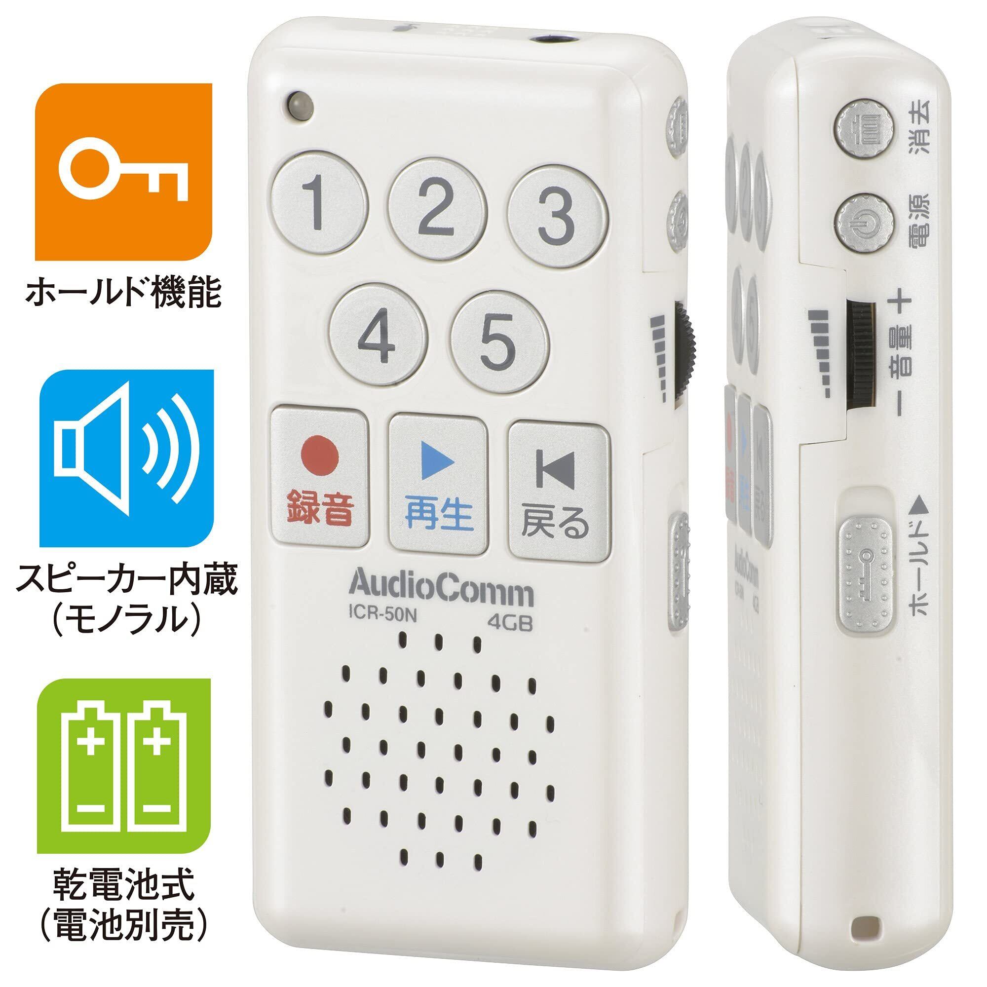 オーム電機 AudioComm かんたんIC レコーダー ボイスレコーダー 録音機 音声録音 小型 再生会議 メモ録 ミニ 軽量 コンパクト 長時間録音 ICR-50N 03-1400 OHM ホワイト