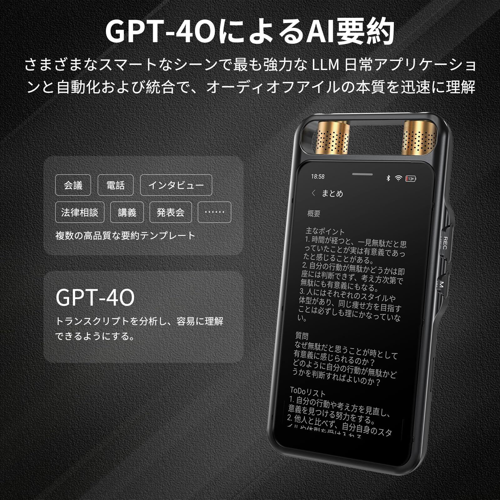 【録音機能の自由度】・国際コンテスト1位優勝のノイズ除去技術と8個のマイクを搭載し、雑音環境でも、最大15mの範囲で360度クリアな音声を収録します。重要な会議やインタビューもしっかりと録音します。・リアルタイム文字起こし機能を備え、録音中でもテキストとして内容を確認可能。日本語や英語、中国語、韓国語など13言語に対応し、日本語なら98%以上の精度で文字起こしします。文字起こししたデータはWi-FiでPCやスマホへ簡単に送信できます。・Open AIと連携しワンクタッチでテキスト内容を基に自動で要約を作成します。自動要約機能で、長時間の音声データも効率的に整理、面倒だった議事録作成も短時間で完了します。(文字起こし画面の右上隅にあるロボットのアバターをタップすると、要約します。)・さらに、これらの機能が無制限かつ無料で利用可能。月額料金や有料プランへの移行は不要です。※より高精度の文字起こしにはWi-Fiなどのネットワーク接続が必要です。