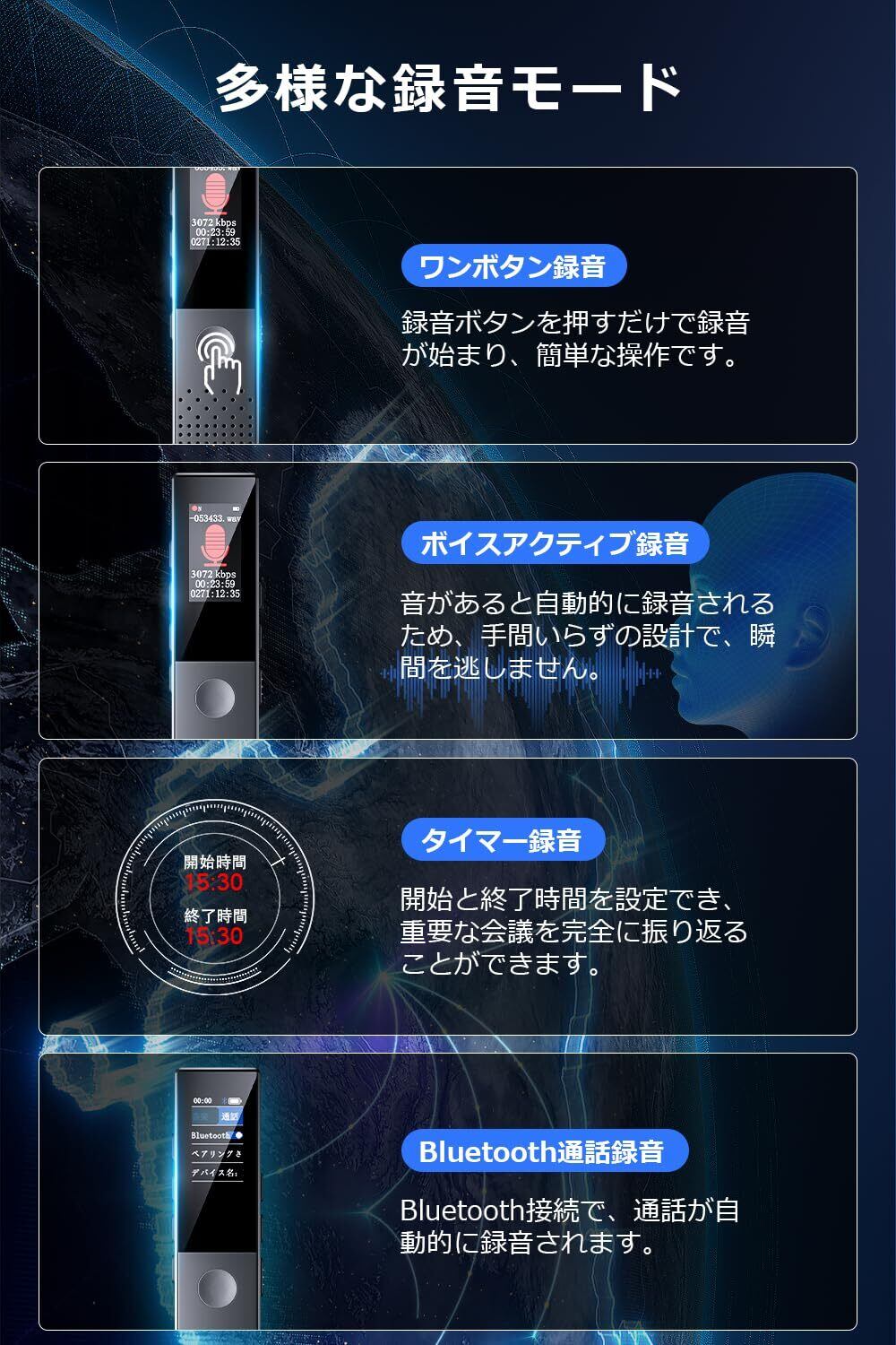 ボイスレコーダー 小型 ICレコーダー 【2024新版 64GB大容量】 3072kbps音質 Bluetooth5.2技術 ENCデュアルマイク 長時間録音 コンパクト 録音機 ワンボタン録音 液晶画面 ヴォイスレコーダー VOR録音対応 タイマー録音 変速再生可 リピート機能付 スピーカー内蔵 パスワード保護 インタビュー/議事録作成/言語学習などに適用 イヤホン付 日本語説明書付