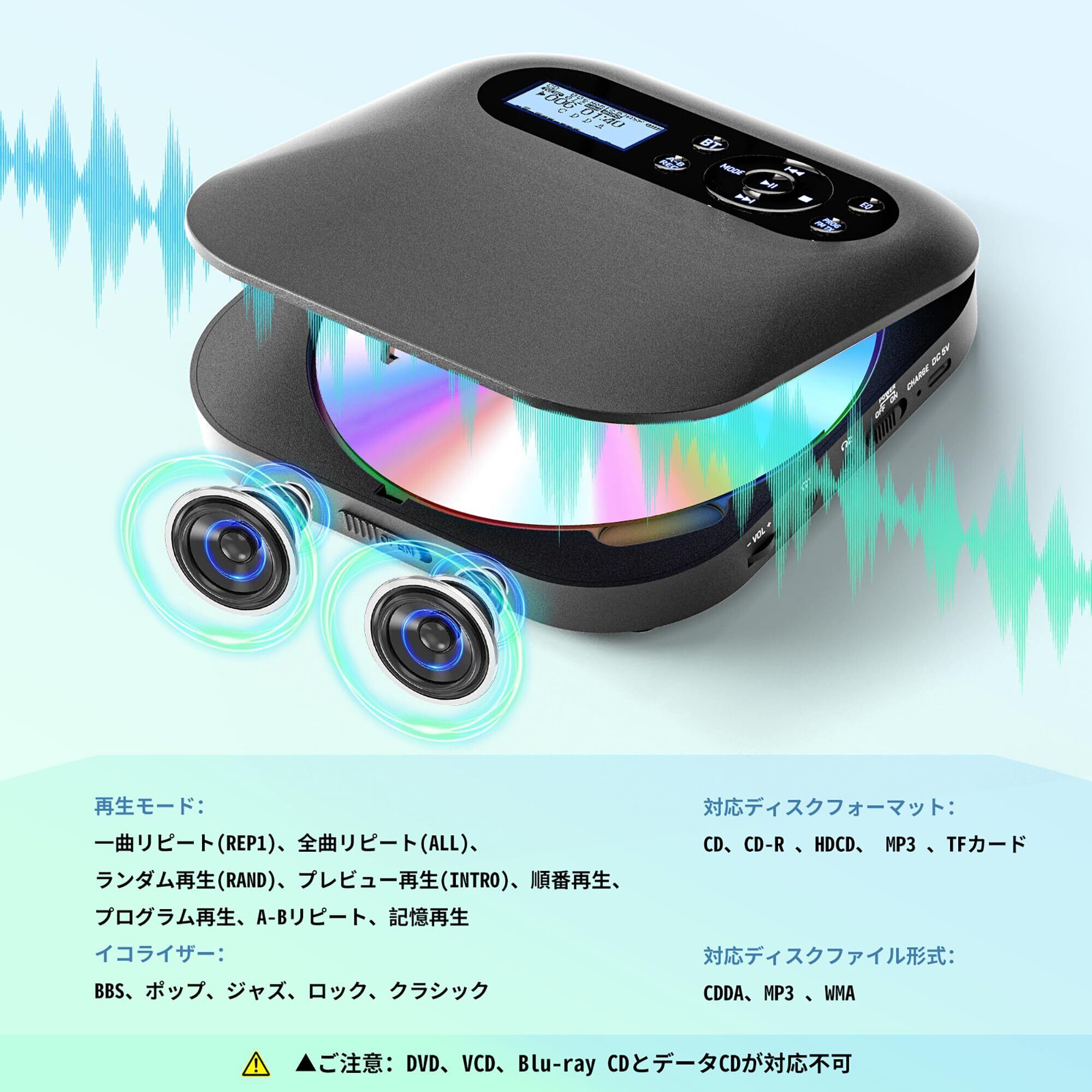 ①【Bluetooth5.2対応&スピーカー内蔵cdプレーヤー 】Bluetooth送信をサポートして、お手持ちのBluetoothヘッドセットやBluetoothスピーカーに接続して、より自由に音楽を楽しむことができます。▲注:車のBluetoothはサポートされていません。本体にデュアルスピーカーを内蔵しているポータブルCDプレーヤーので、外部のスピーカーやイヤホンに接続することなく音楽を楽しめます。▲本機はBluetooth送信のみ対応なので、スマホ・タブレット・パソコン・iPadなどのBluetooth受信対応機器を接続け再生できません。