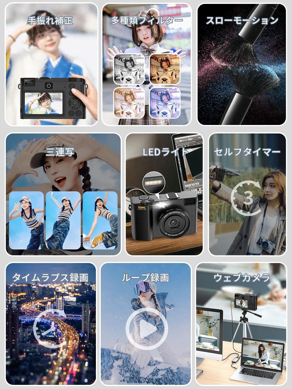 【豊富な機能搭載】3.0インチIPS液晶モニターを採用しており、大画面で被写体をはっきり確認できます。ピントを自動的にあわせるオートフォーカス機能が搭載されており、ぼやけることなく美しく鮮明な写真を簡単に撮影することができます。電子手ぶれ補正機能が搭載されており、強力なアルゴリズムが被写体を鮮明に認識し、画面の安定性を維持することで、フォーカスのずれやフォーカスエリアの重なりを防ぐことができます。また、ビューティーフィルター、三連写などの多彩な機能を搭載しており、初心者の方でも撮影を楽しめる5Kカメラです。高画質ビデオ通話や生放送を行うなどウェブカメラとしてもお使いいただけます。LEDライトも付属しているので、夜間や暗い部屋での撮影も簡単に行うことができます。