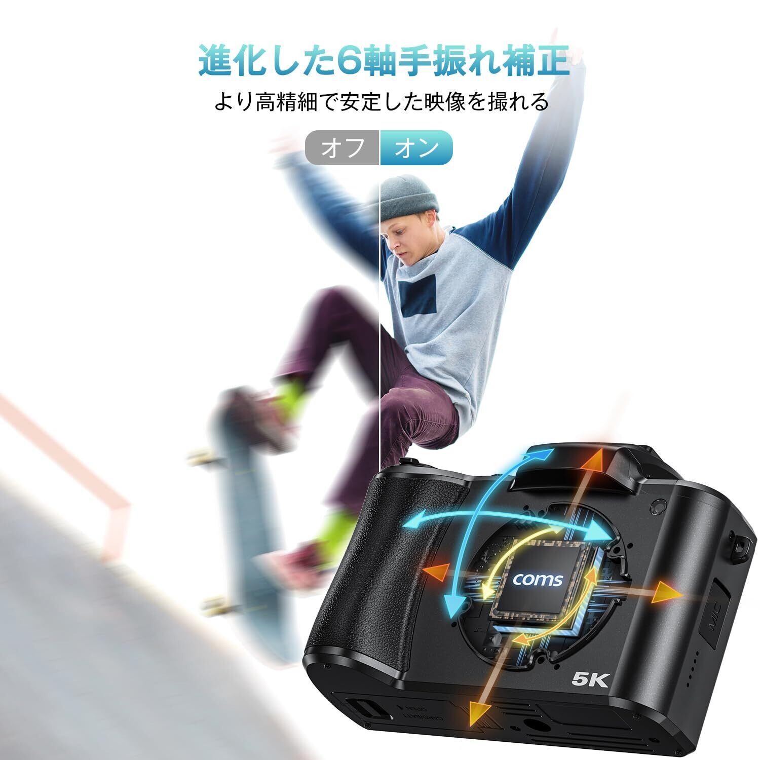 【6軸手振れ補正&オートフォーカス機能】6軸手振れ補正により、6方向から手ブレを補正し、歩きながらの撮影でも驚くほど安定した映像を実現。動画も静止画も、まるで三脚を使ったかのような滑らかさで、思い出をそのままの美しさで残せます。また、オートフォーカス機能を搭載して、手動調整の必要がなく、瞬時に焦点を合わせて素敵な瞬間をキャッチする。 内蔵AF補助ライトがあり、暗い場所や被写体が動いている状況でも、素早く正確にピントを合わせることが可能です。