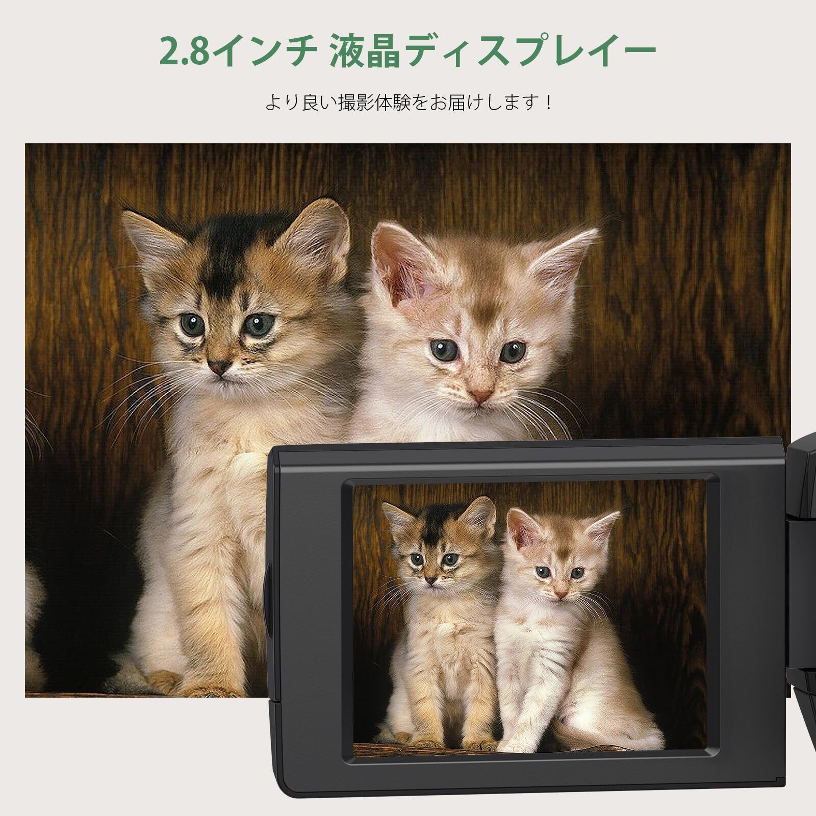 【2.8インチ液晶ディスプレイ&16X デジタル ズーム】ビデオカメラは2.8インチ液晶ディスプレイを搭載し、鮮明で繊細な画面プレビューと操作ガイドインタフェースを提供し、撮影を簡単に制御することができます。270度回転することもできるので、自分撮りをしたいときにも便利です。16X デジタルズームを搭載し、重要な詳細をキャプチャし、遠くの物体をより鮮明に表示するために拡大で、 ビデオ愛好家にとって理想的な選択肢です。