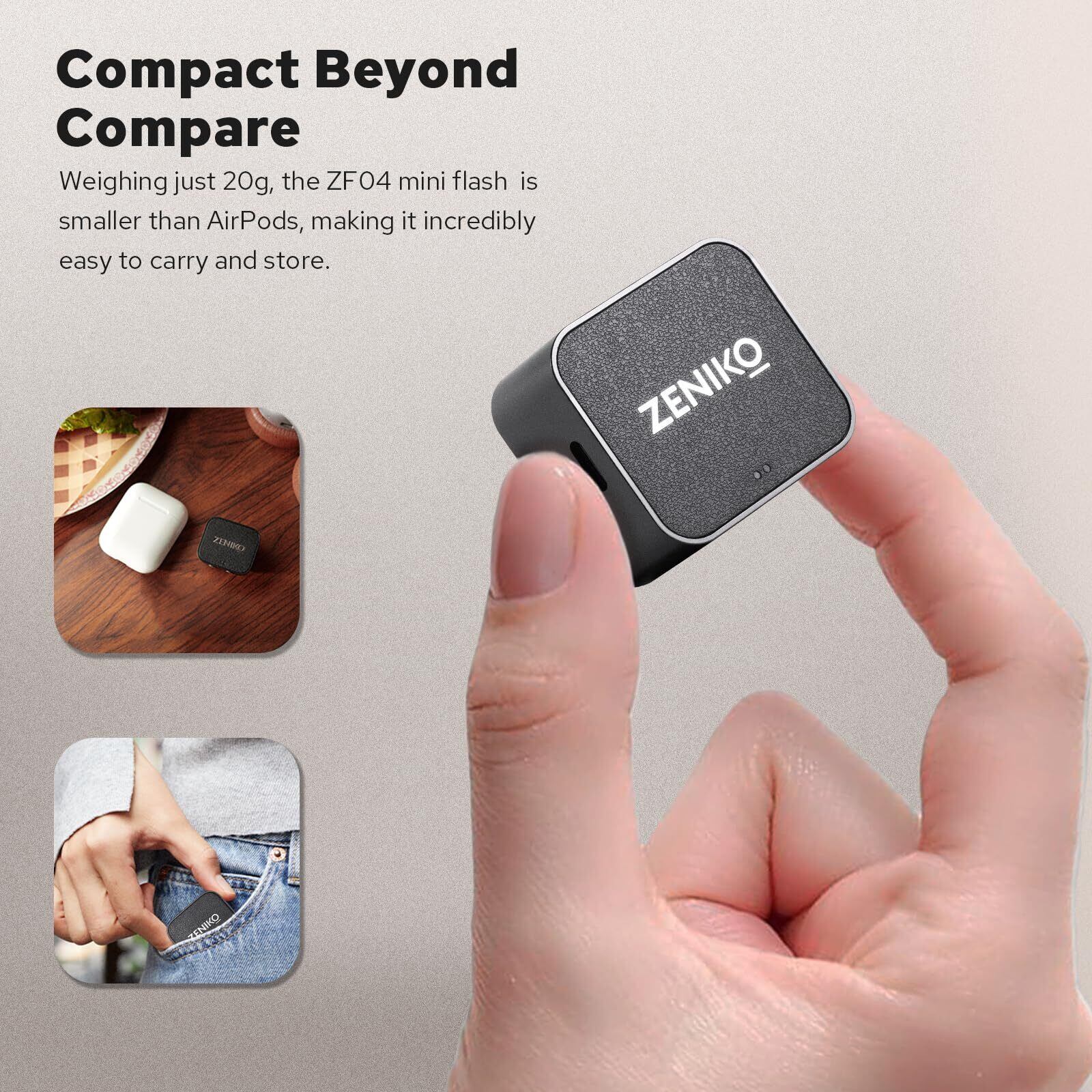 [ポケットサイズ]ZENIKO ZF 04 mini speedliteはわずか20グラムの重さで、手のひらに入れることができ、ポケットに入れたりカメラに取り付けたりしやすい。航空アルミニウム材、金属ケースにレトロな革模様をつなぎ合わせ、洗練されたレトロなデザイン。