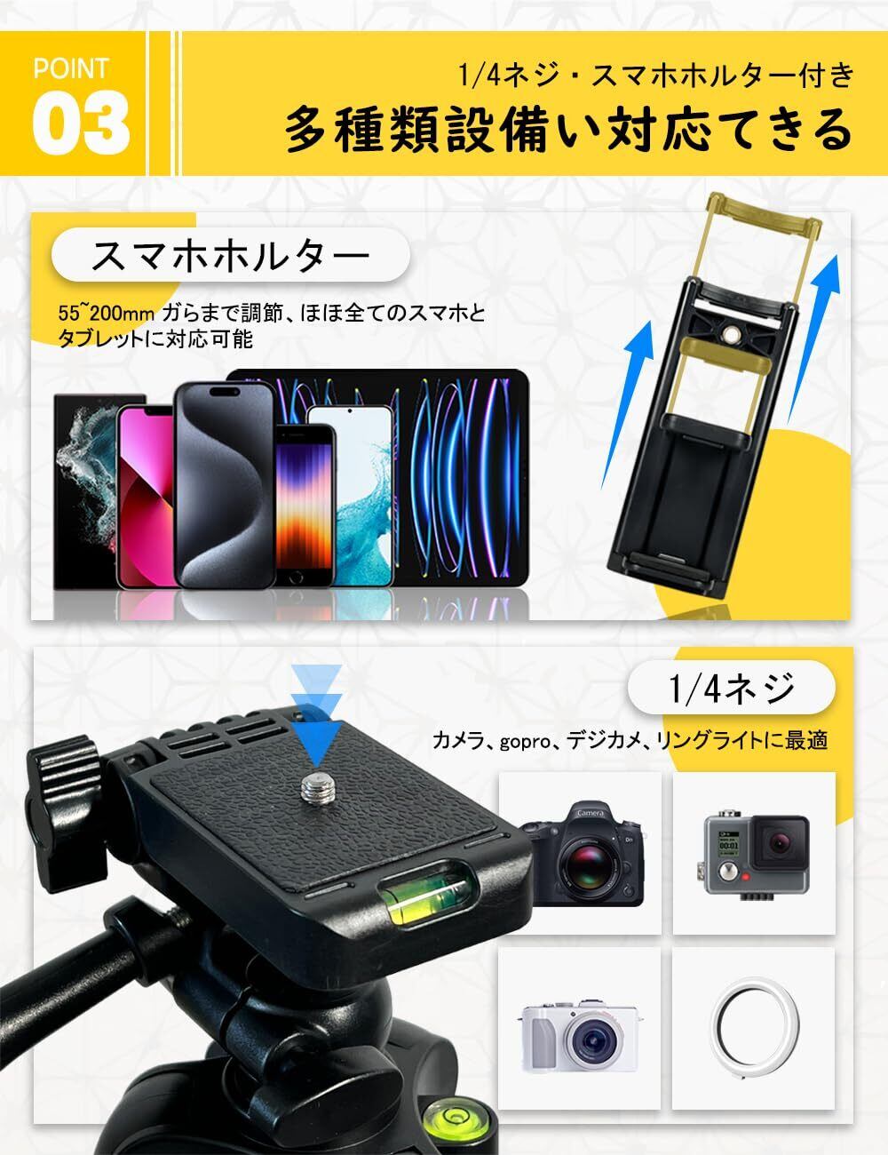 【3WAY雲台付き&多機種対応】:皆さんご存知の通り、3方向の角度を個別に調整できることは3WAY雲台の長所となります。風景写真など、きっちり構図を決めたり水平を取ったりする必要がある場合は、3WAY雲台が必須になります。その分カメラの動きは制限されてしまうので、思いがけない撮影チャンスに手持ち撮影で対応でき。のスマホ 三脚はスマホ、iPad、デジカメ、ビデオカメラ、一眼レフなど様々な機種が対応可能です(1/4ネジ有り)。水準器も搭載し、素晴らしい撮影の構図を発見しましょう!