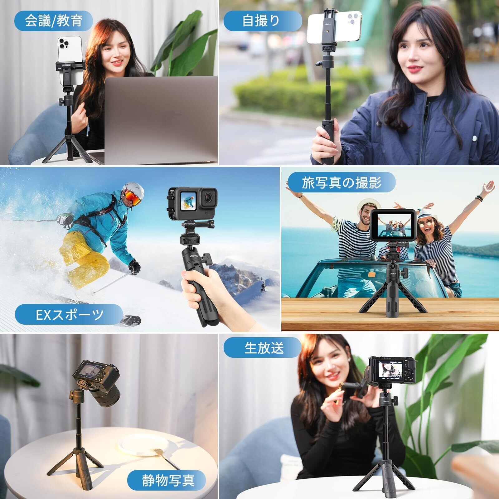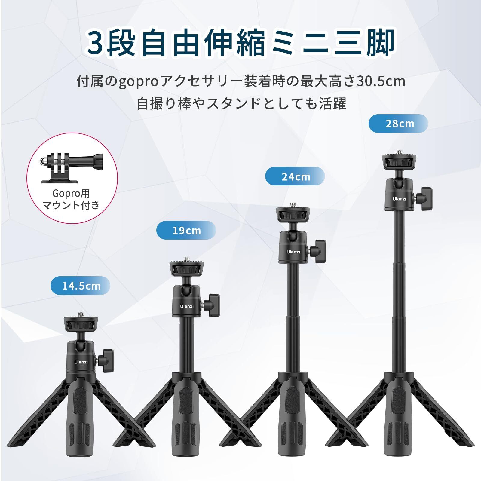 Ulanzi M12 ミニ三脚 カメラ三脚 3段伸縮 自撮り棒 卓上三脚 Gopro用マウント付き 360度回転 自由雲台 1/4ネジ穴 持ち運び便利 vlog ビデオ セルカ棒 折りたたみ GoPro用/Sony用/OsmoPocket用/Canon用/Nikon用/Android/iPhone用/アクションカメラなどに対応