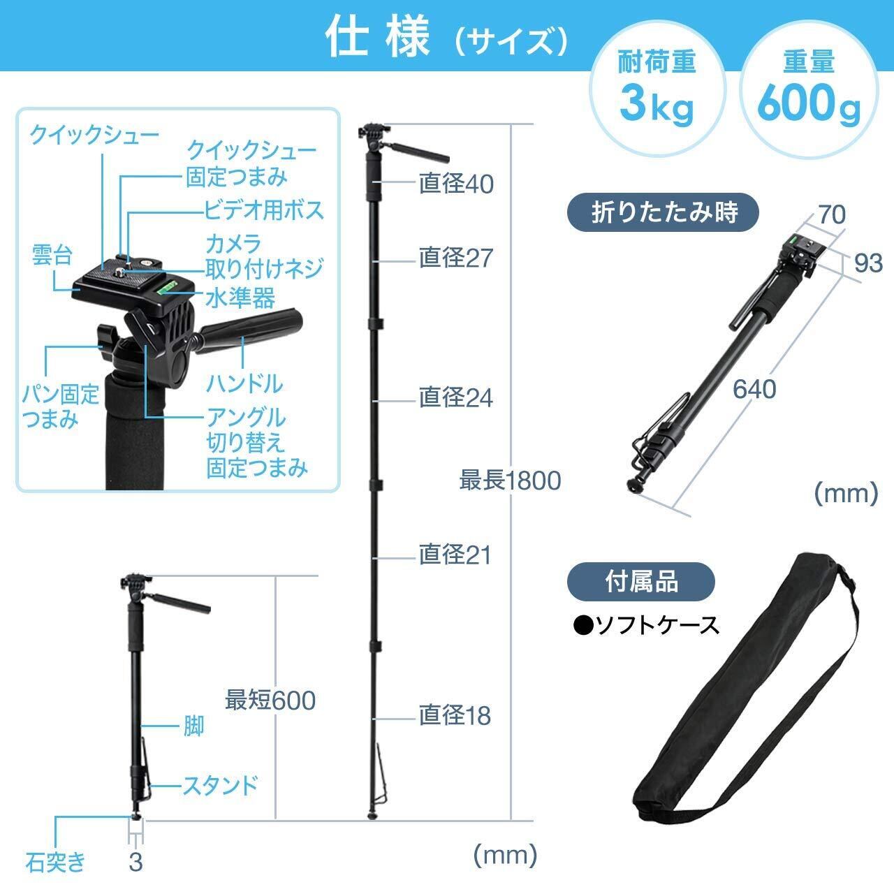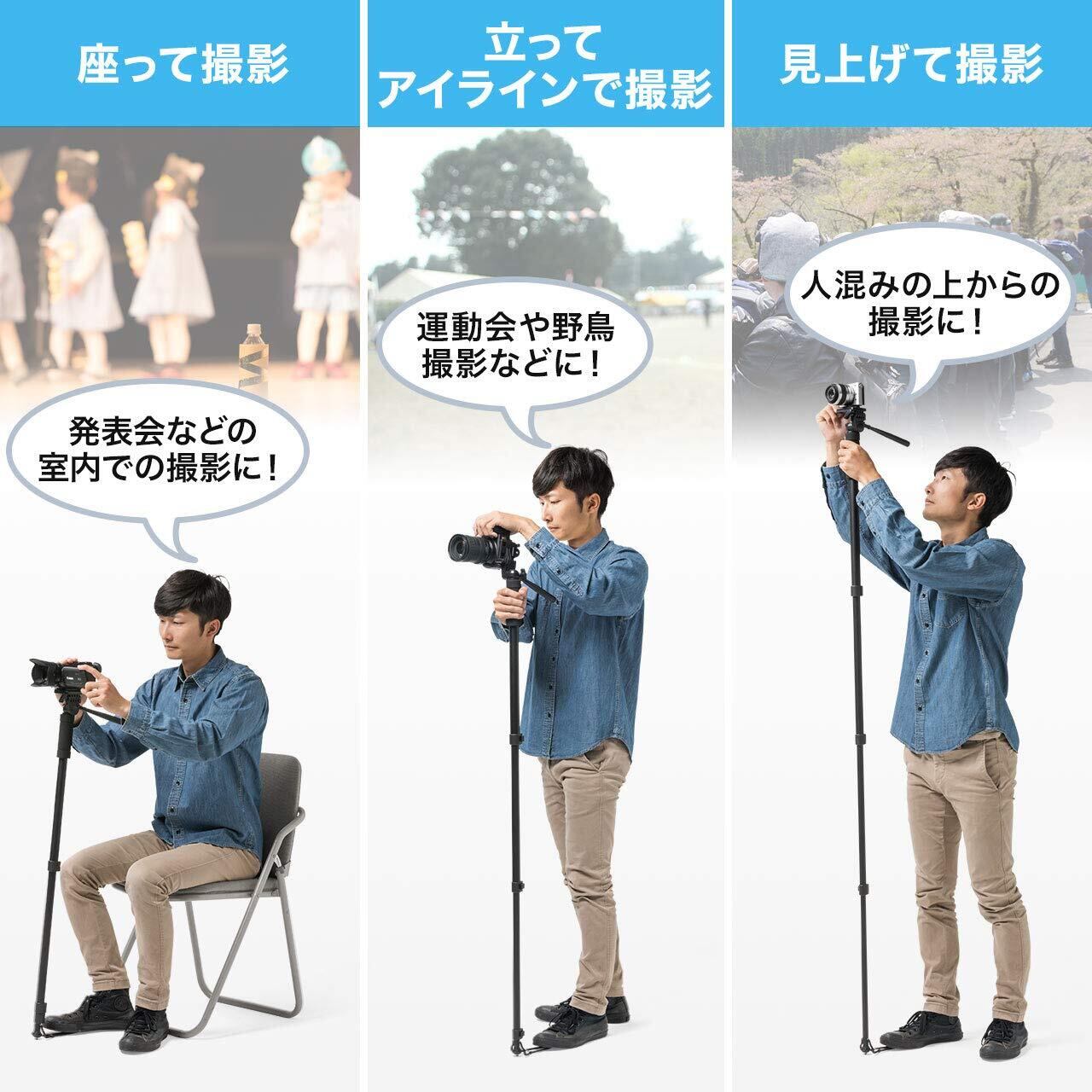 一眼レフやミラーレスカメラで三脚を立てるスペースが無い場所で使えるカメラ用一脚です。