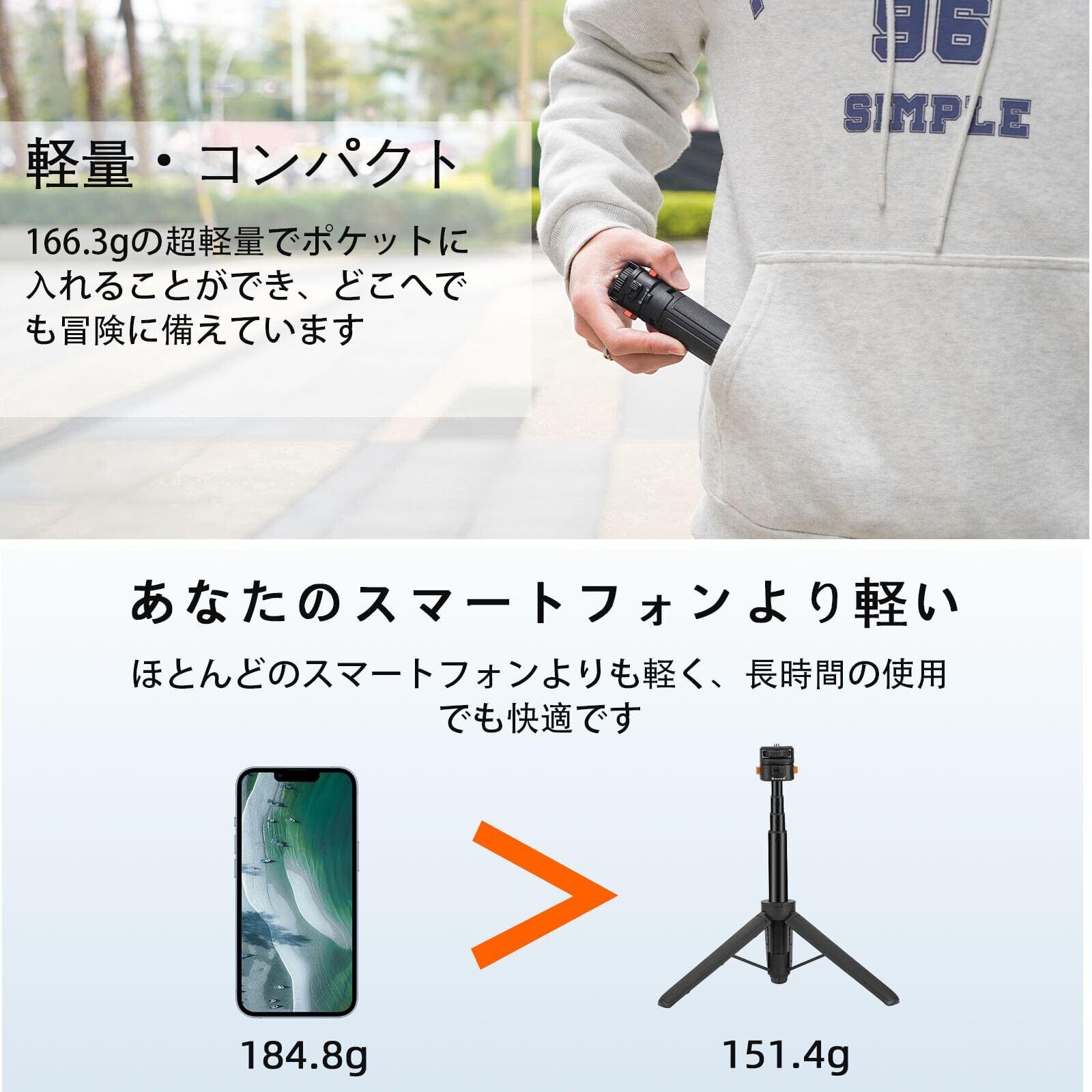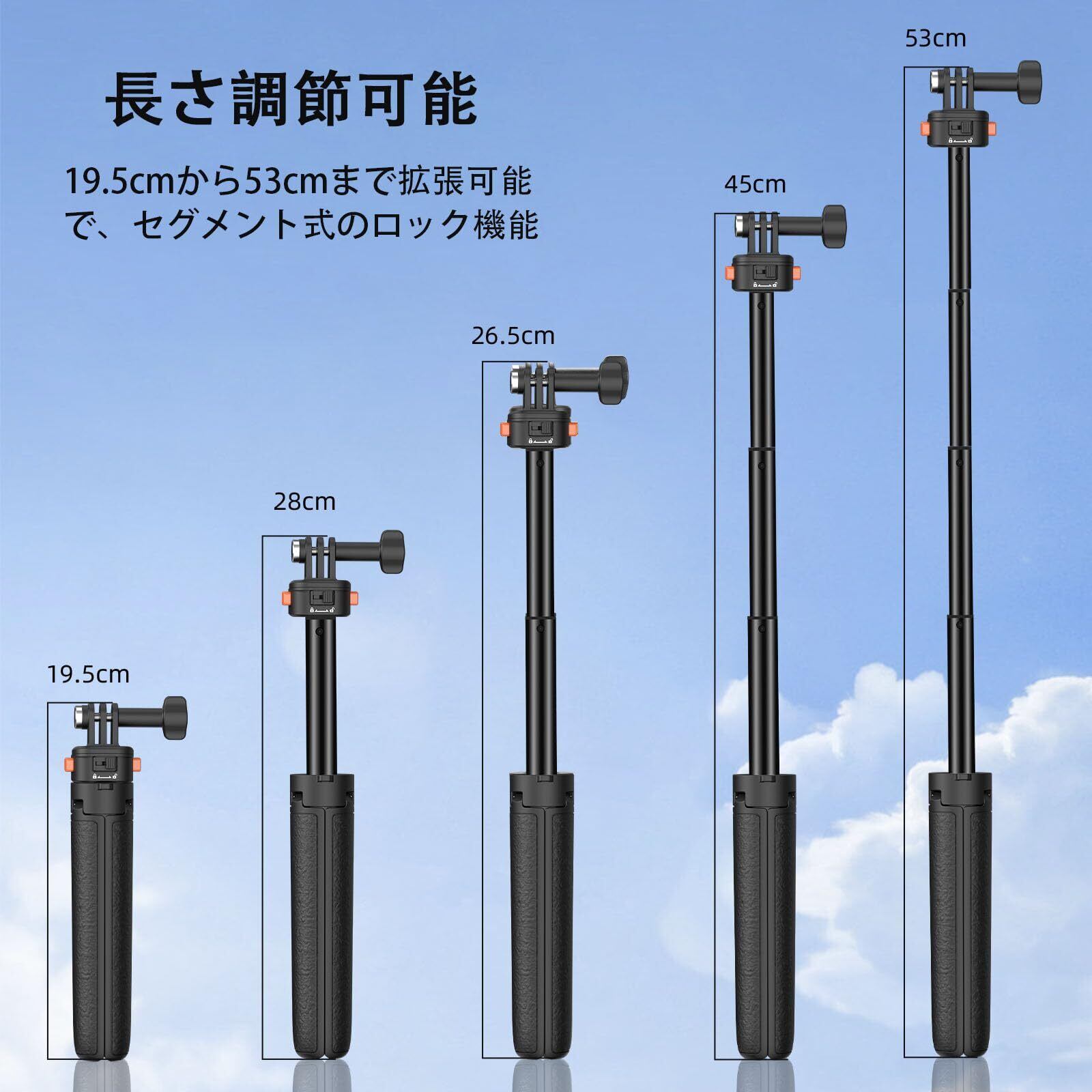 アップグレードされたワンパッケージ設計 —— この革新的なブログ用トライポッドは、セルフィースティックとカメラトライポッドをシームレスに切り替えられるモードで組み合わせています。アップグレードされた伸縮式設計により、下部の OPEN ボタンを使って、ハンドヘルドグリップと安定したトライポッドモードの間で瞬時に変換できます。セルフィー、ブログ撮影、アクションスポーツ(スキー / サーフィン)、旅行、グループ写真撮影に最適です。