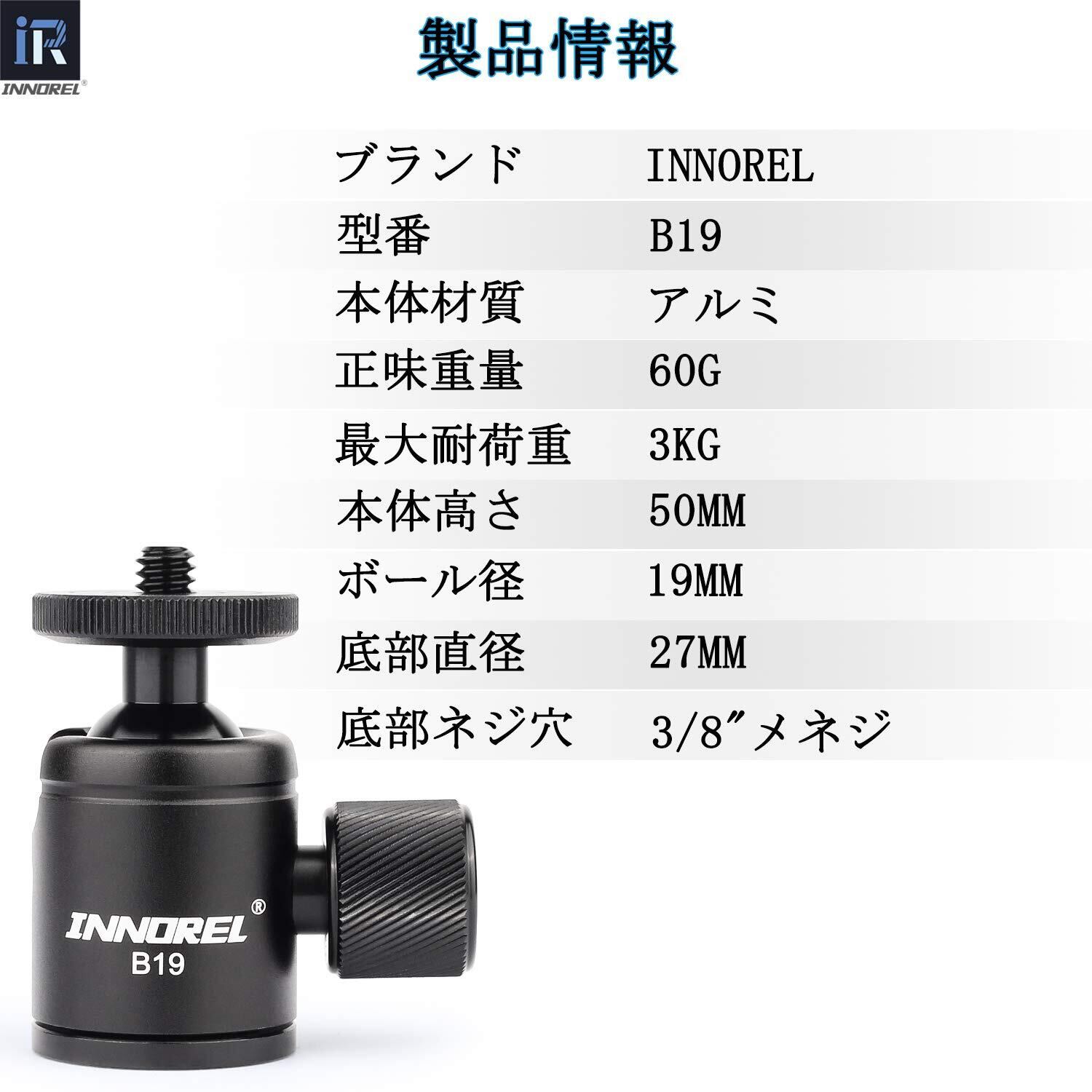 INNOREL 小型 自由雲台 マイクロ ボールヘッド 超ミニ 360°回転可 パノラマ雲台 コンパクト 19MMボール径 底面径27MM 耐荷重3KG 超軽量 アルミ製 カメラ ライト スタンド 三脚 スピードライト用(B19 ボール雲台)