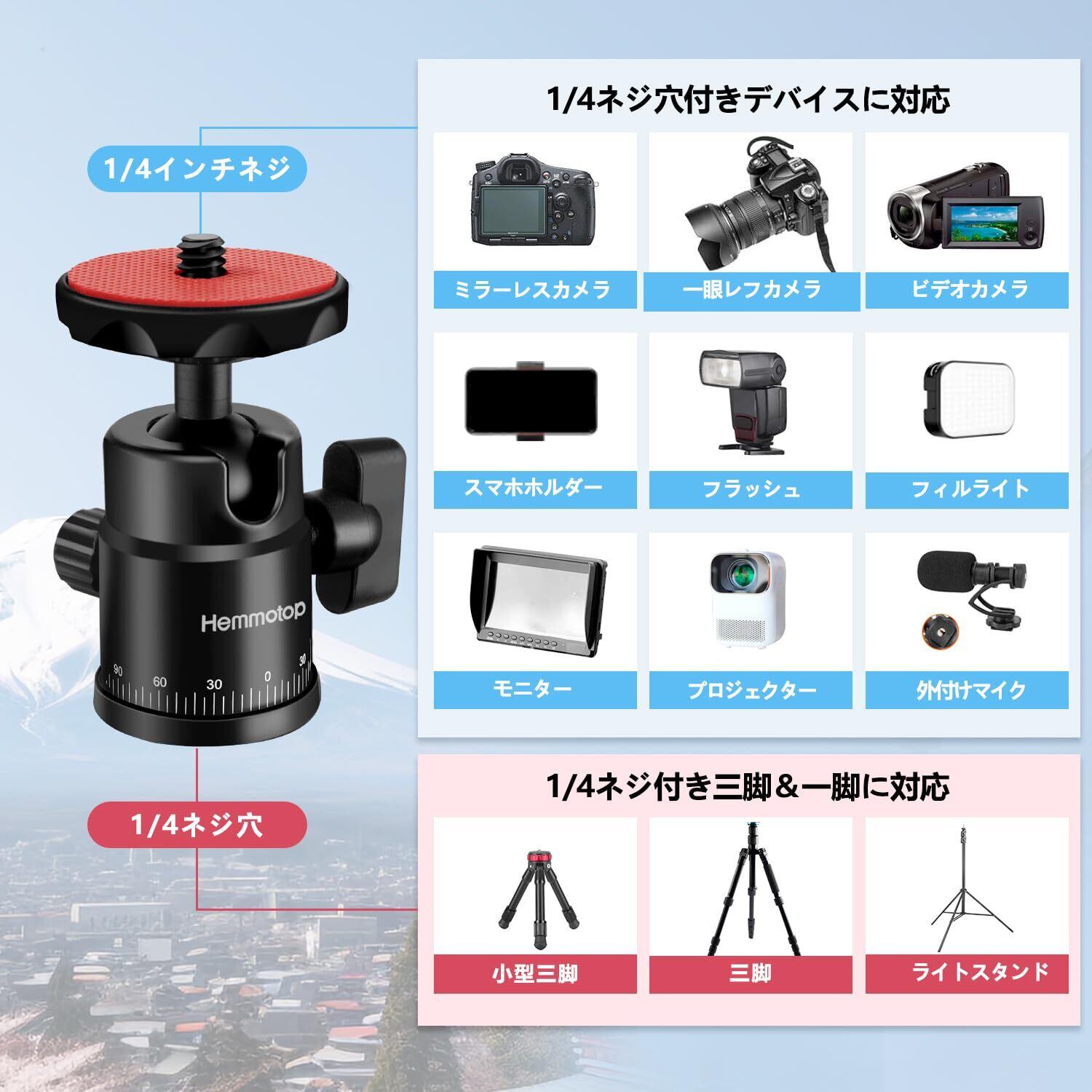 HEMMOTOP 雲台 小型 軽量 自由雲台 三脚 用 パノラマ雲台 1/4"ネジ付き ボールヘッド カメラマウント H28-レッド DSLR用/ビデオカメラ/一脚/一眼レフカメラ用 耐荷重5㎏