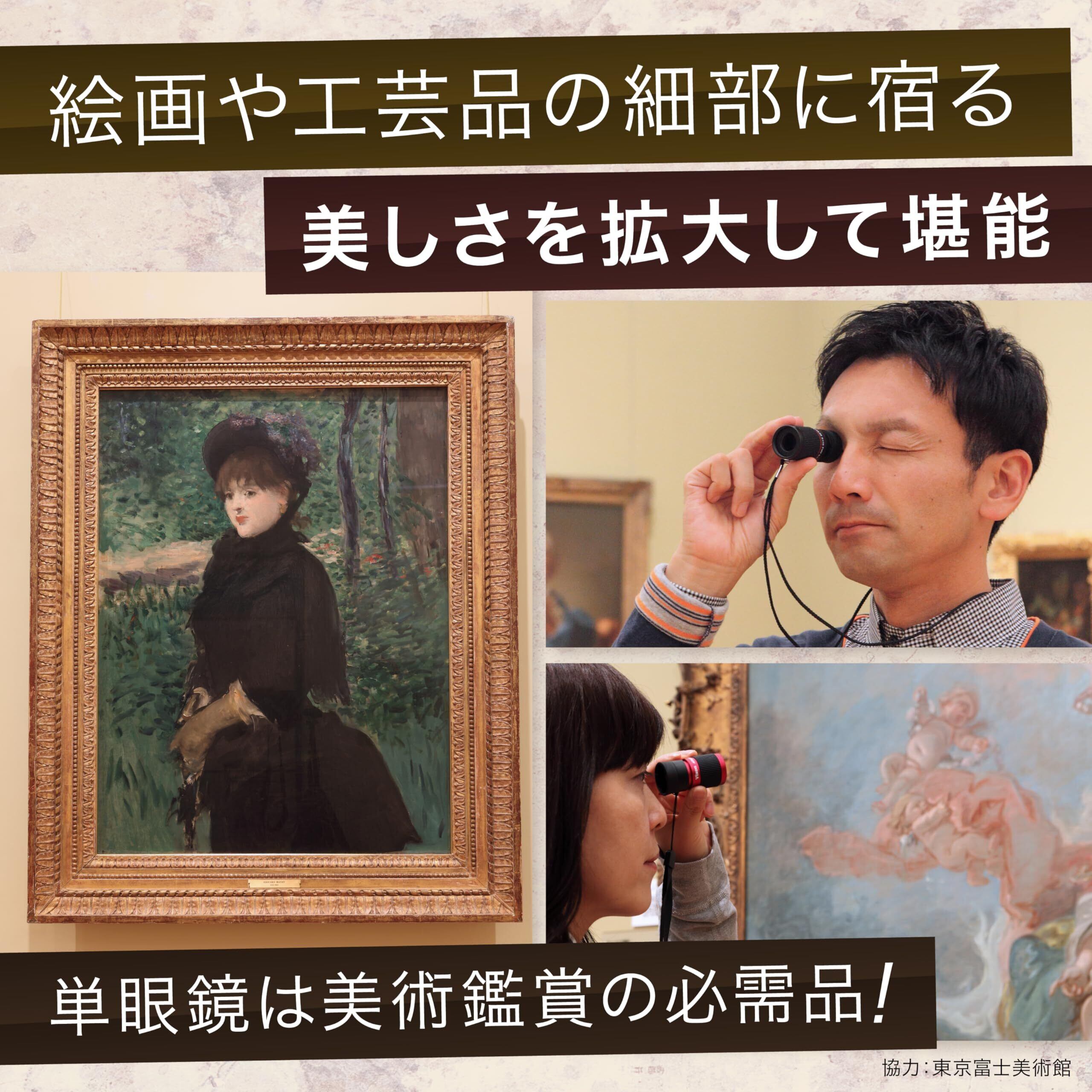 手のひらの中にすっぽりと納まるミニサイズモノキュラー。美術鑑賞や会議、講演会、セミナーなどビジネスアイテムとして推奨します。