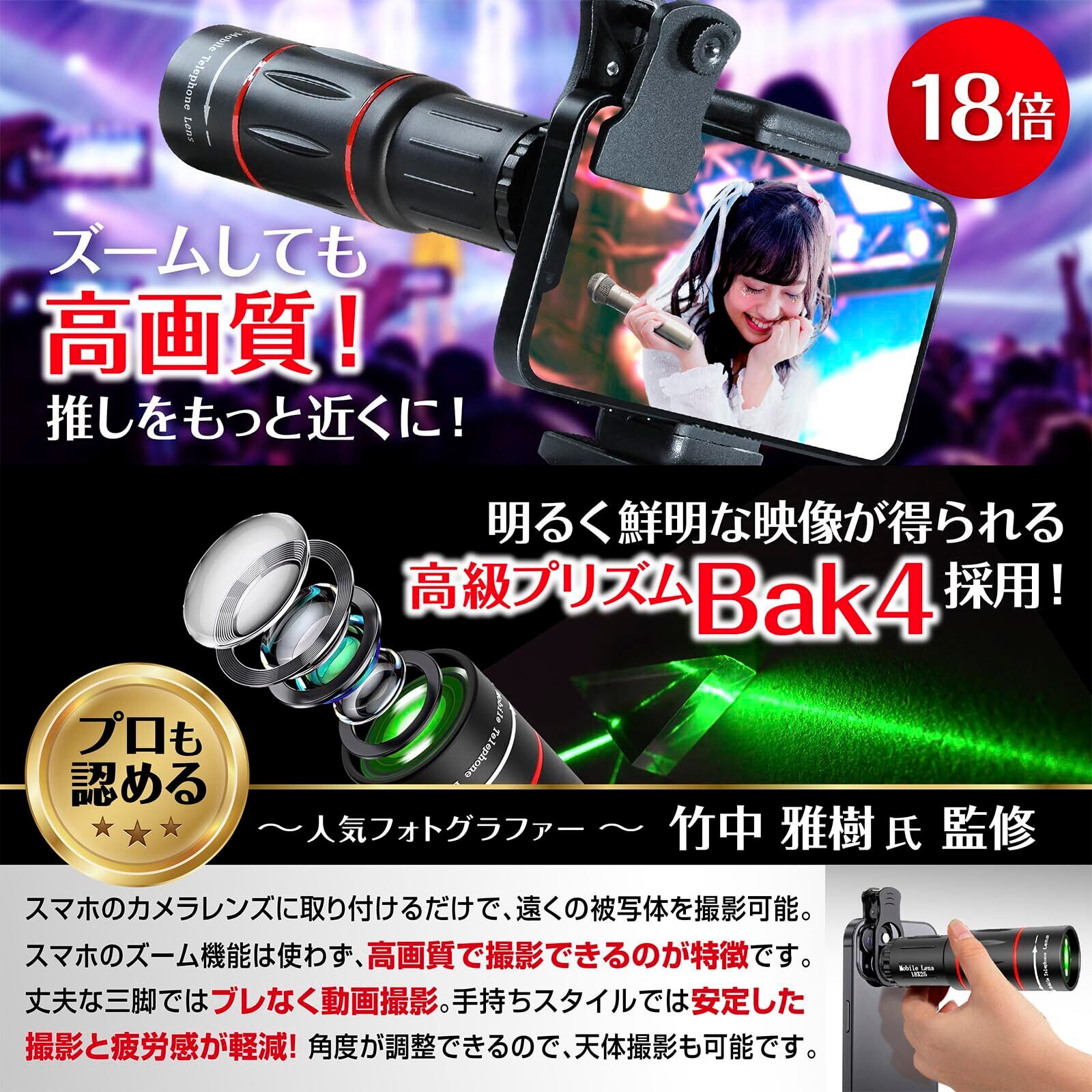 【人気フォトグラファー監修 高倍率18倍】スマホで遠距離を高画質に撮れる単眼鏡が登場!ズーム機能だと画質が悪くなる・・・そんな悩みを解決する高倍率18倍の望遠単眼鏡。一眼レフカメラに劣らない画質をスマホで撮影ができる最強アイテムです。単眼鏡のレンズは明るく鮮明に見える高級プリズムBak4を採用!※複数レンズの場合 スマホ側でのズーム倍率によって起動するレンズが切り替わるので、ズーム倍率を固定していただいた後、起動しているカメラにお取り付けください。