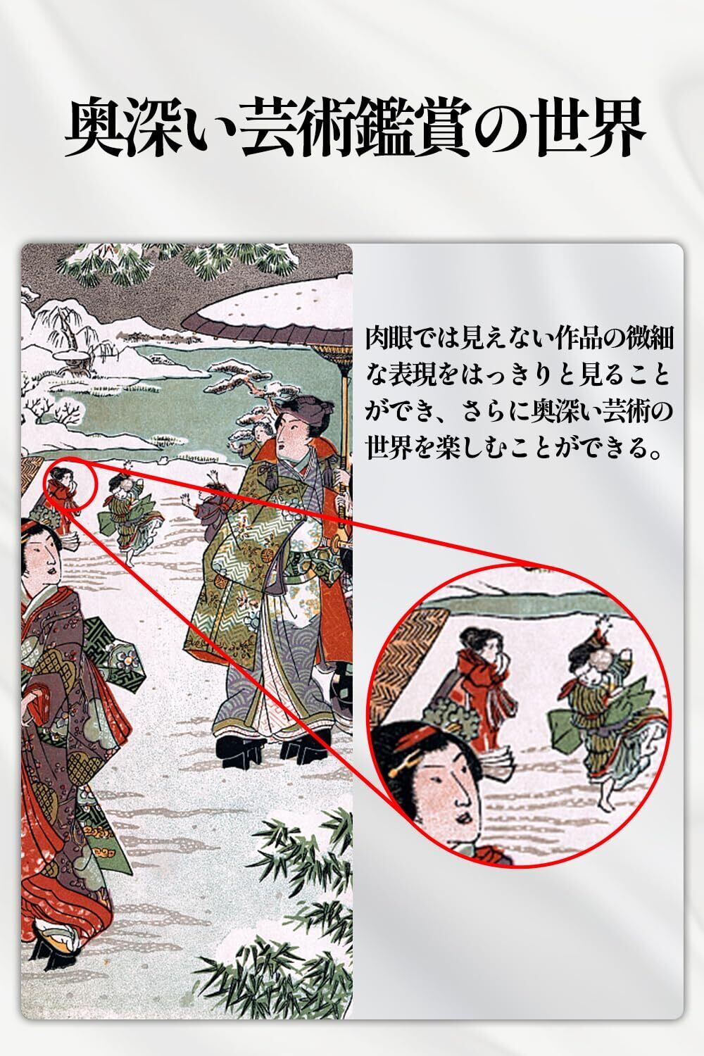 【幅広いシーンで大活躍】手ブレを起こしにくい小型単眼鏡はメガネをかけるでも対応できて、楽に目標物を見える!特に美術館で美術鑑賞をすすめです。 【細部を観察するには】着物、刀剣、絵画、国宝、宝飾品、浮世画、日本画、彫刻、屏風、洋画など楽しみ方に最適です。【拡大を観察するには】案内図、看板、スポーツ、鳥観察、動物観察、風景、黒板など楽しみ方に最適です。お年寄りに最高のプレイスです。