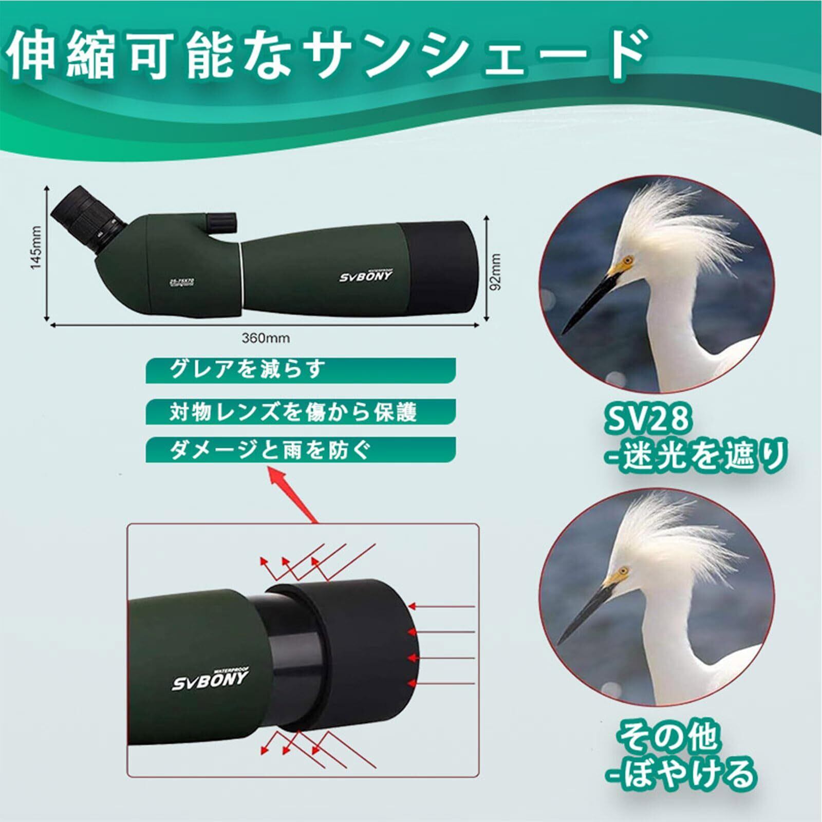 【25-75倍のズーム高倍率-小型軽量】SV28スポーティングスコープは初心者向けに設計されて、コンパクトで小型軽量なデザインで(ただ786g)、持ち運びが容易です。また、焦点を合わせたり倍率を変更したりするのも簡単です。25x、50x、75xズーム倍率により、 低倍率では広い視野を、高倍率では細部を拡大して見ることができます。野鳥や風景を見るときにセットアップが簡単で、初心者レベルのバードウォッチングや写真撮影に最適です。