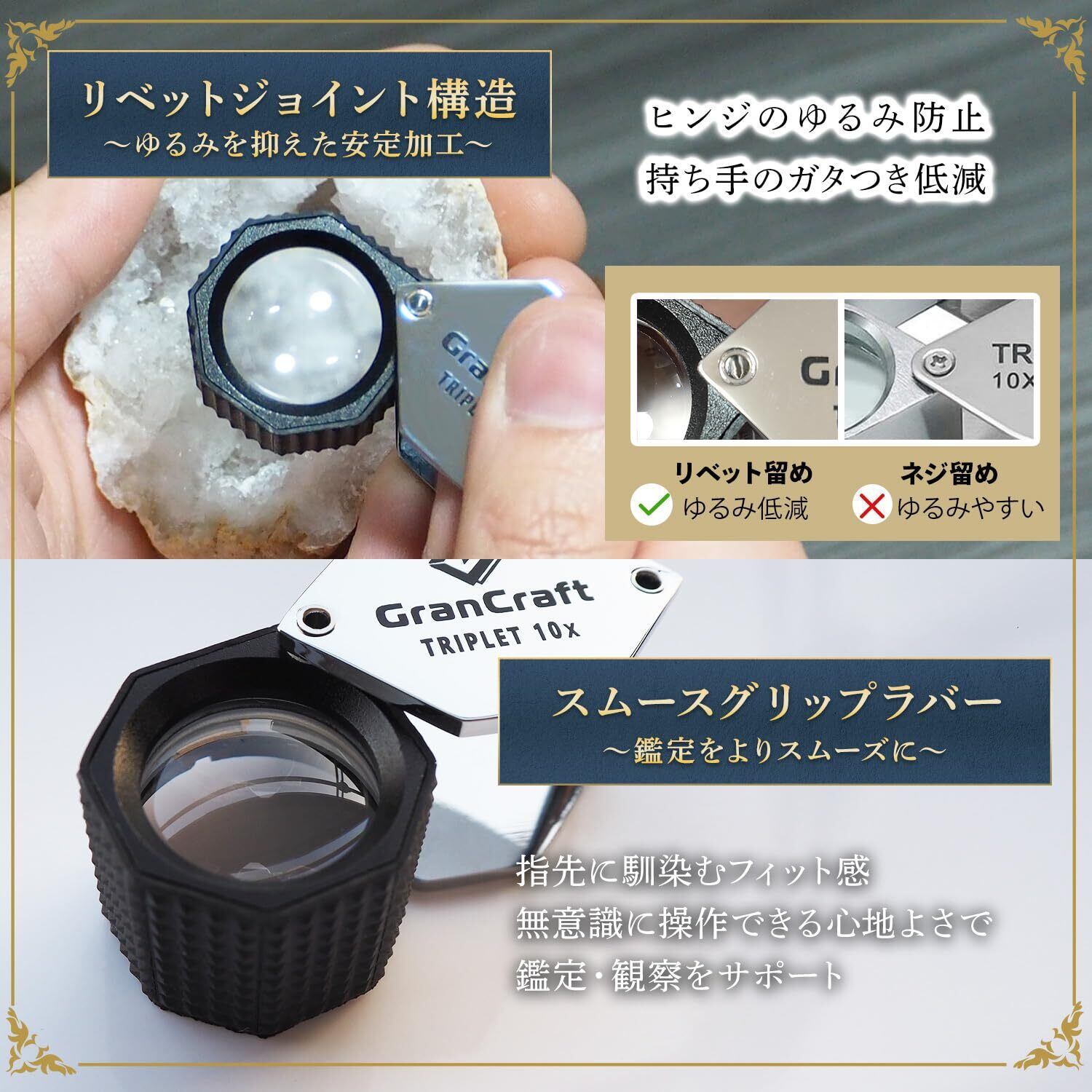 【プロ鑑定士と共同開発】 ルーペ GranCraft 【待望の"ワンサイズ大きめ" 20.5mmレンズ】 観察 鑑定 検査 10倍 ジュエリールーペ 拡大鏡 【鑑定最適倍率x3重構造トリプレットレンズ】 【A9レンズ採用xリベット留めでゆるまない】