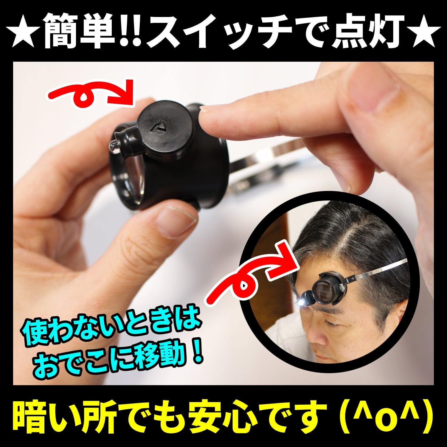 【サイズ】展開時:全長51cm レンズ直径4.2cm 使わない時はおでこに移動!オシャレで機能的【使用電池】コイン電池×2 電池品番:CR1620 【付属】45日間の書付き 【商品重量】27g(電池込み)