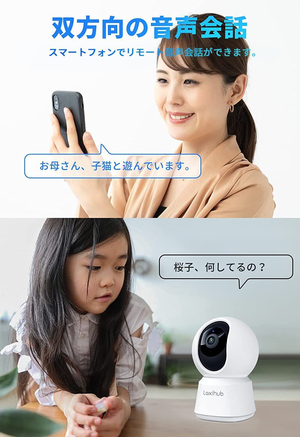 本製品は双方向オーディオ機能を備えており、アプリを通じて家族やペットとお話しすることができます。外出先でも大切な瞬間を共有でき、心配事を解消します。