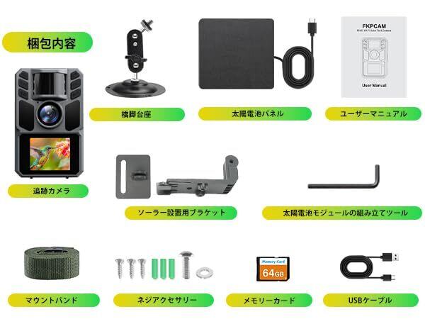FKPCAM トレイルカメラ ソーラー式 狩猟用 4K 64MP 防犯カメラ|0.1秒トリガー 高感度センサー ソーラーパネル&5000mAh充電池搭載 IP67防水防塵 山林・野生動物観察に最適 64GBカード付き