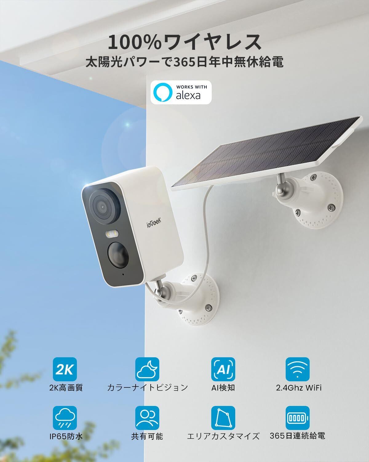 - 特徴:PIR人体検知、夜間カラー撮影、双方向音声、ソーラーパネル付き