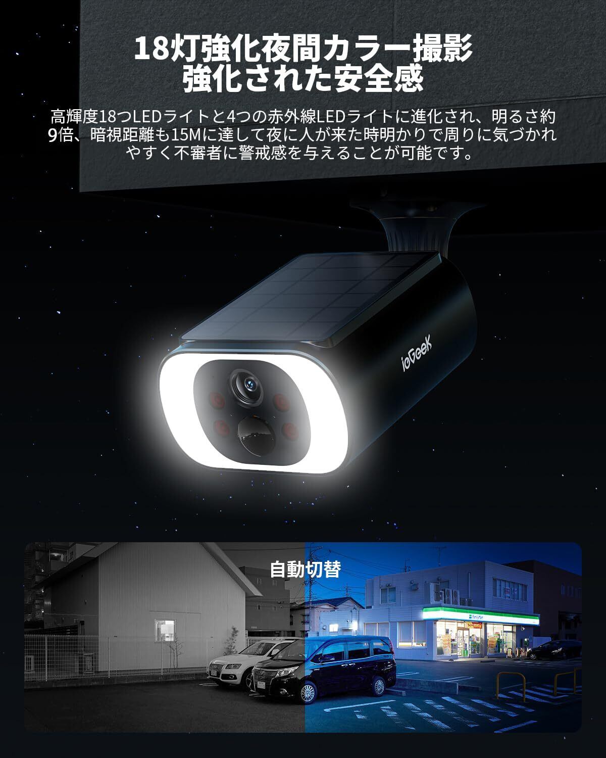 【ソーラーパネル一体型・充電も配線も不要・永久無料クラウド】ieGeek 防犯カメラ 屋外 ソーラー 一体型 ワイヤレス/wifi 18灯強化夜間カラー暗視 PIR人体検知 Alexa対応 監視カメラ 屋外 完全無線 電源不要 110°超広角 録画 双方向音声 警報通知 防犯対策 IP65防水 電池式防犯カメラ 庭/玄関/車庫/駐車場 屋外 メモリカード対応(黒)