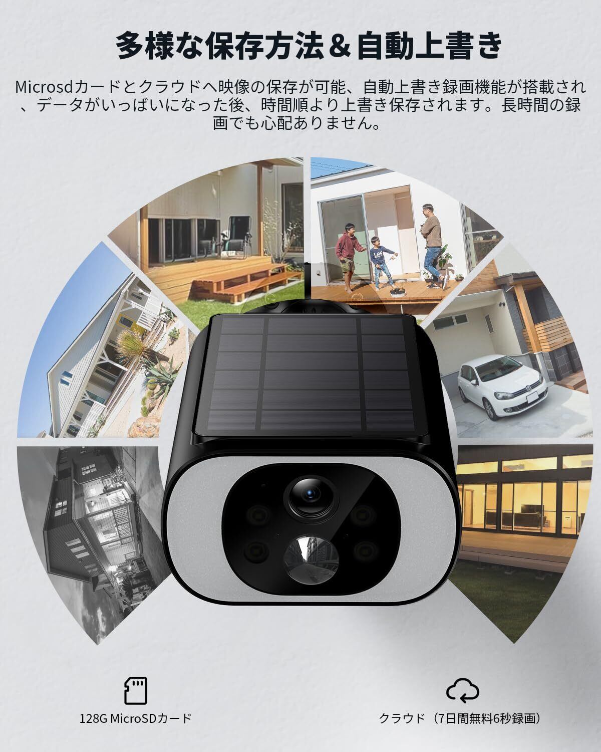 【強化防水設計●流暢な双方向音声●家族と一緒に共有●Alexa対応】特にソーラーパネルが増加する必要もなく、USBポートが完全に閉じて密閉性と防水性能が抜群で、春夏秋冬にどのような天候でも長期使用できます。同時にカメラ管理者として他の人に閲覧/操作のことを許可することができ、家族や友達が同時にリアルタイムで録画を視聴可能です。マイクを通じて現場にAndriodやiphone携帯アプリ経由カメラ側と通話可能です。不審者に対して声をかけて止められたり、出張でも外出でも家族と一緒に高齢者の介護と子ども等通話でき、日常の様々な場面で役に立ちます。ALEXAに対応し、音声アシスタント対応なので、忙しくて手が空かないときでも、話しかけるだけでモニタリング画面を閲覧できます。