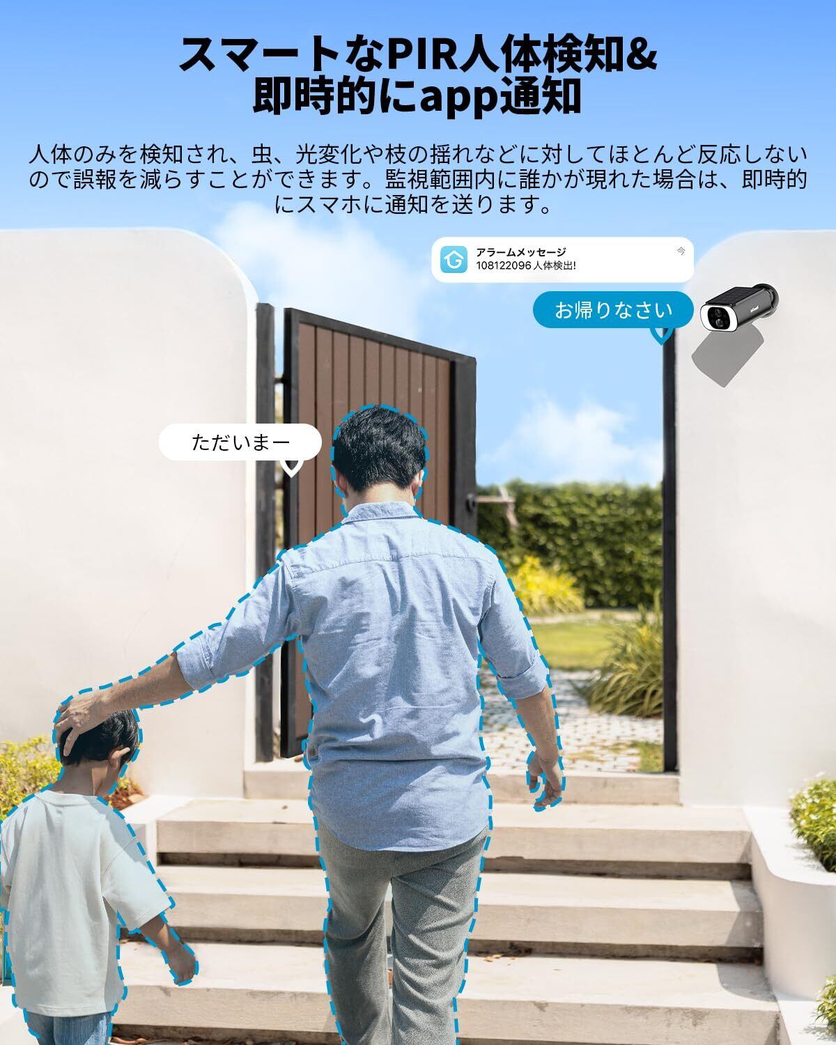 高度なPIR人体検知センサーが不審な動きを察知し、動きを捉えると即座に通知をスマートフォンへ送信します。外出中でも安心して状況を把握でき、セキュリティを強化します。