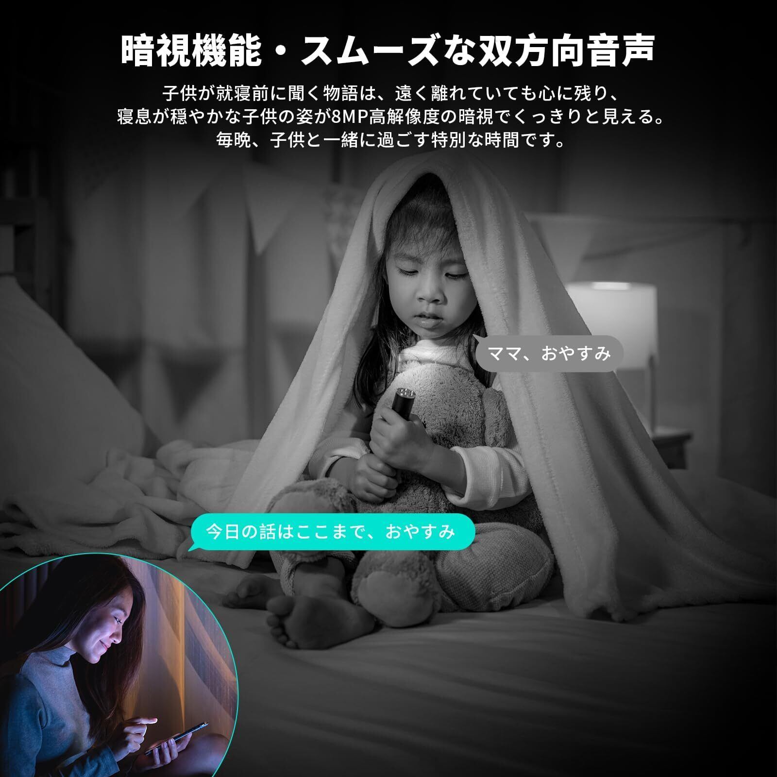【家族共有&全面的な知能検知&自動追跡】❶ベビーカメラはQRコードでシェア画面をスキャンするだけで、家族全員が簡単にペットや子どもの成長に参加できます。❷人体、音声、動き3つの知能検知機能で、ペットが留守番中に何か問題があったり、子どもが帰宅したり、窓の外に不審者が現れたりした場合でも、防犯カメラの映像で対象を検知し、スマホに通知が届きます。家で何が起きているかを瞬時に把握できるので、自分のことに集中できると同時に、心配事を一掃できます。❸自動追跡機能も搭載しているので、新しく迎えたばかりの犬や猫が人見知りで隠れている場合でも、自動追跡によりどこに隠れているのかが分かるため、ペットの居場所を見失う心配はありません。