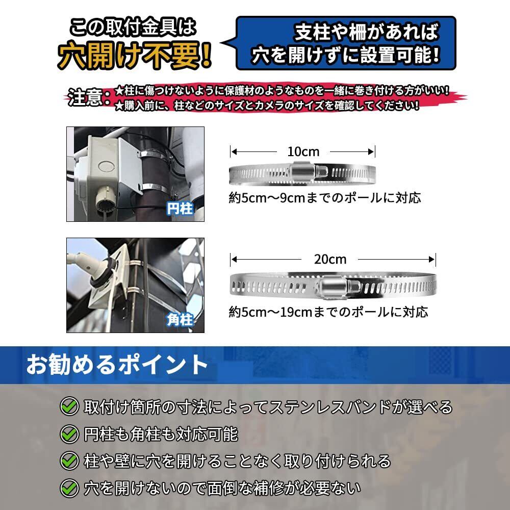 JEBUTU 防犯カメラ 取付金具 ブラケット ポール 取り付け金具 スタンド マウント ハウジング 監視カメラ 固定 角柱 円柱 穴あけ不要【すぐ使える フルセット 】 ステンレスバンド 4本 (バンドサイズ直径20cm 直径10cm)/ ボルト セット4式 / 防犯ステッカー 6枚 付属