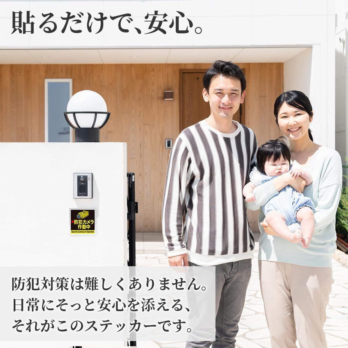 黄ステッカーの効果:~警告カラーで『狙われない家』に!~「黄色×黒」の配色は犯罪者に強い警告を与えるカラーです。この警告カラーに視認性の高い防犯カメラデザインを組合せることにより瞬時に「リスクの高い家」を印象づけ犯罪者を遠ざけることができます。