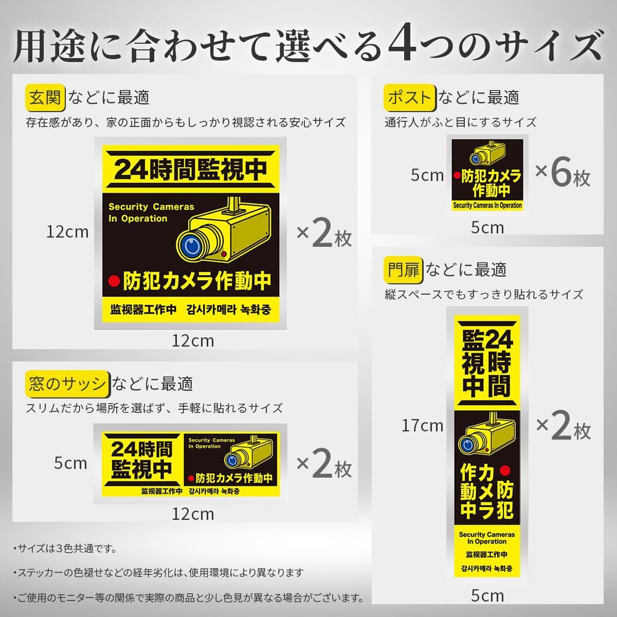 サイズ:12×12㎝(2枚)、5×12㎝(2枚)、17×5㎝(2枚)、5×5㎝(6枚) 玄関ドアや事務所入り口、ガレージ、ポスト、表札柱、ゴミ置場、エレベーター前など、さまざまな場所に適用できる4種類の大きさのステッカーをご用意しました。カラー:深めの黄色、赤、黒、紺を使用しています。全体的に派手なアピールカラーは使用しておりませんが、しっかり防犯対策をしていることが伝わるように製作しました。戸建て住宅にも馴染むよう少し高級感を出しつつ深みのある色合いを使用しております。是非お試しください。ご使用のモニター等の関係で実際の商品と少し色見が異なる場合がございます。ご了承ください。