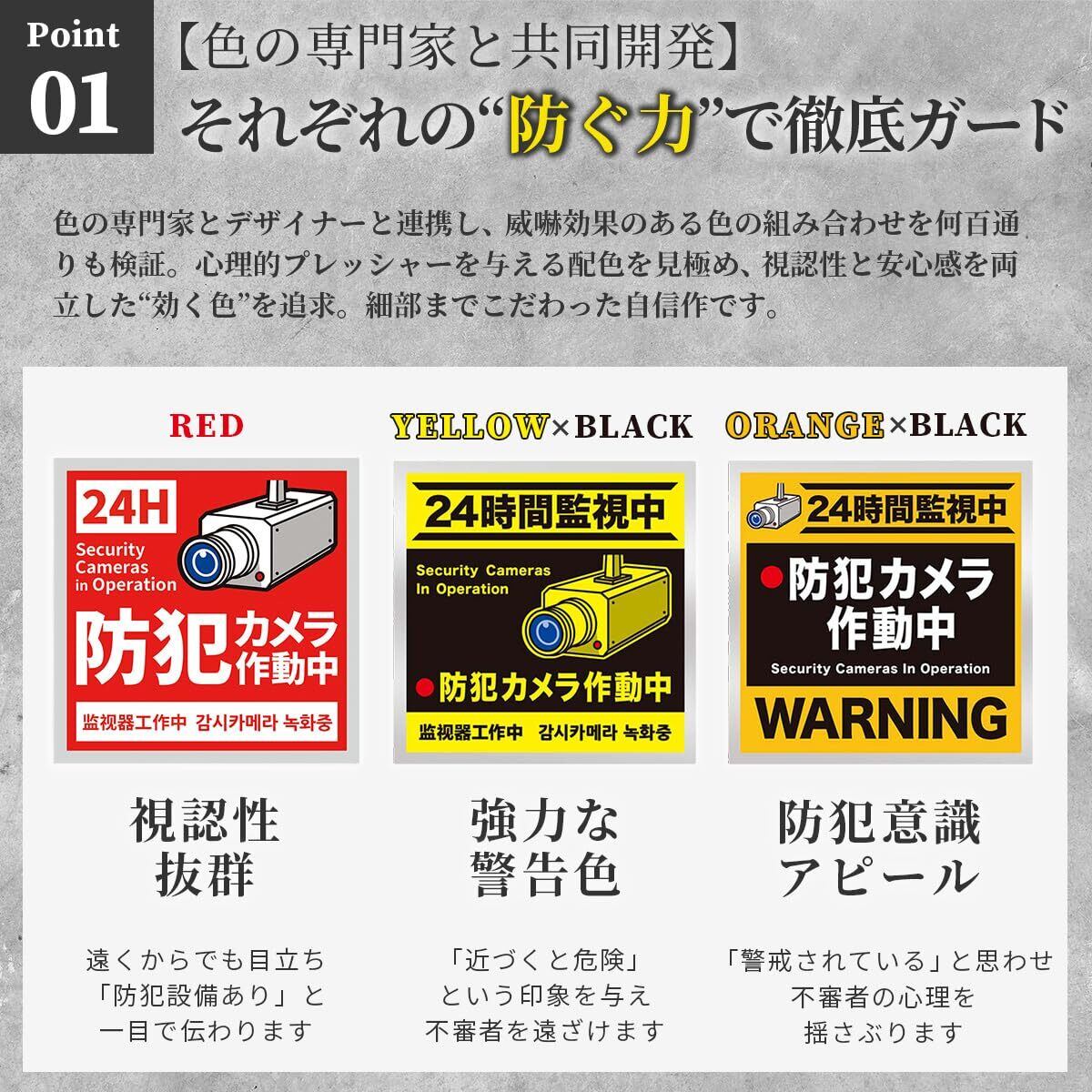 【色の専門家とプロデザイナーがプロデュース】本製品は色彩心理の専門家と経験豊富なプロデザイナーが共同で開発して完成した防犯ステッカーです。犯罪者の心理に深く入り込み「ここは危険だ」「手を出したくない」という心理にするカラーとデザイン。効果に応じて有効な3選(赤ステッカー、黄色ステッカー、オレンジステッカー)をラインナップしました。本製品を玄関や窓、敷地の目立つ場所に貼って『狙われない家』に!