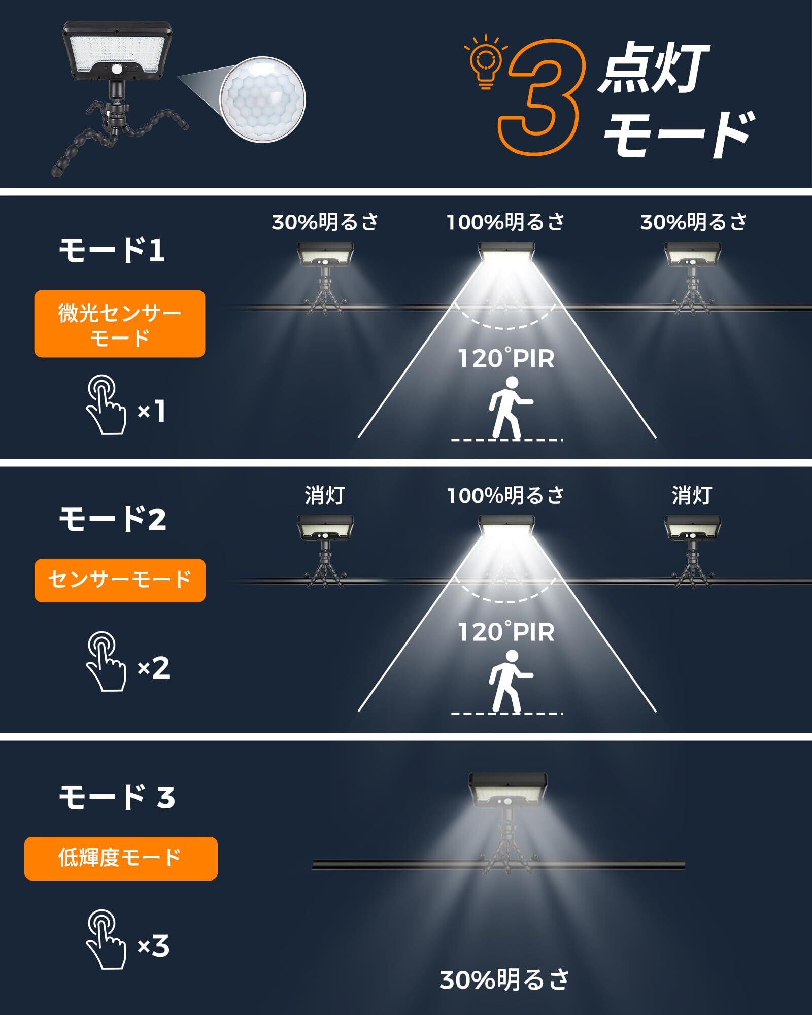 【3モード切替で省エネ&防犯強化】①DIMモード:動体検知時は高輝度点灯、15~20秒後に低照度に自動切替。②センサーモード:人や動物の動きを感知して即時点灯。③常夜灯モード:24時間低光量で基本照明を確保。ledセンサーライトの多機能性で、省エネと防犯を両立。