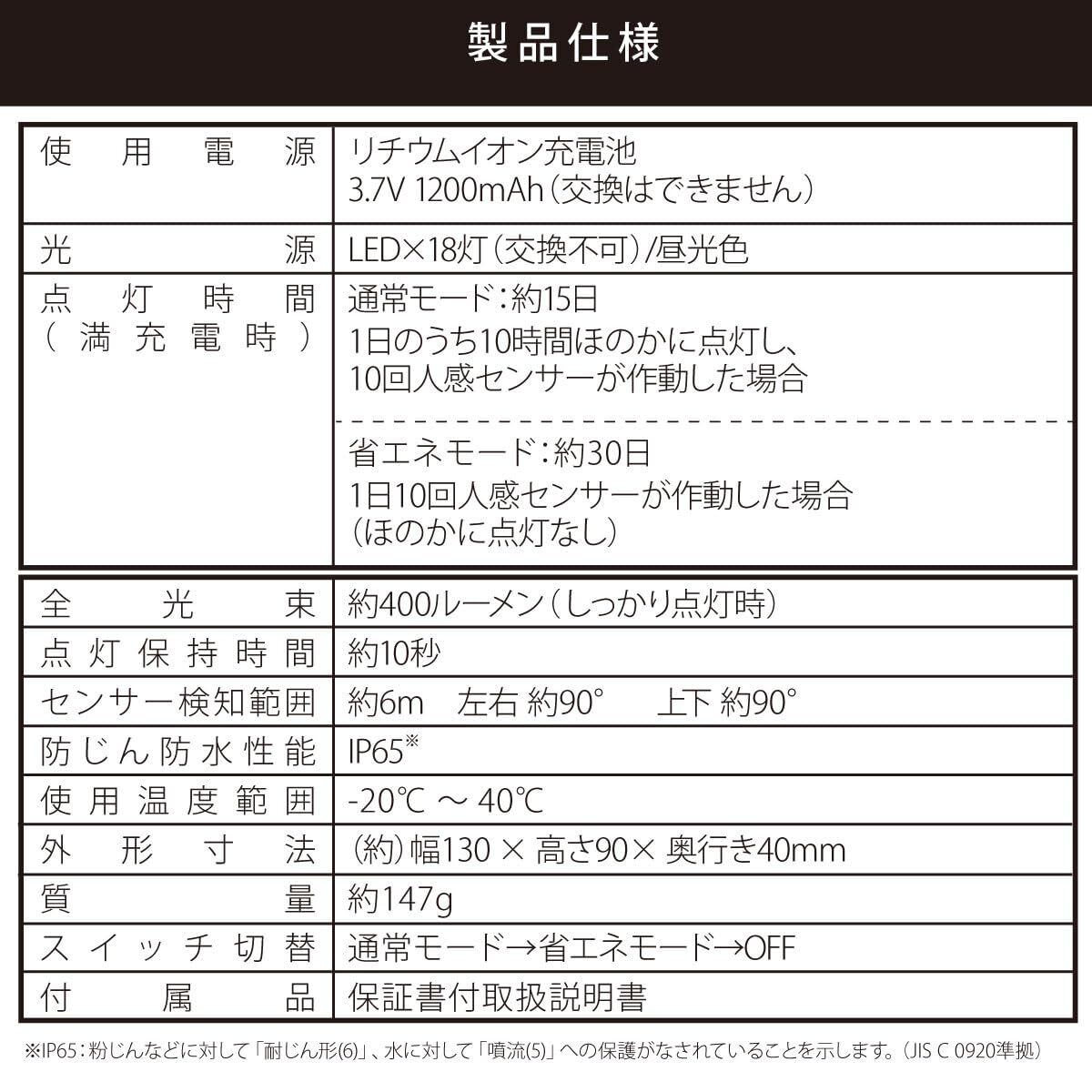 【 仕 様 】 ◆使用電源:リチウムイオン充電池 3.7V 1200mAh(交換はできません) ◆光源:LED×18灯(交換不可)/昼光色 ◆点灯時間(満充電時):・ 通常モード…約15日(1日のうち10時間ほのかに点灯し、10回人感センサーが作動した場合)・ 省エネモード…約30日(1日10回人感センサーが作動した場合 ※ほのかに点灯なし) ◆全光束:約400ルーメン(しっかり点灯時) ◆点灯保持時間:約10秒 ◆センサー検知範囲:約6m 左右約90° 上下約90°
