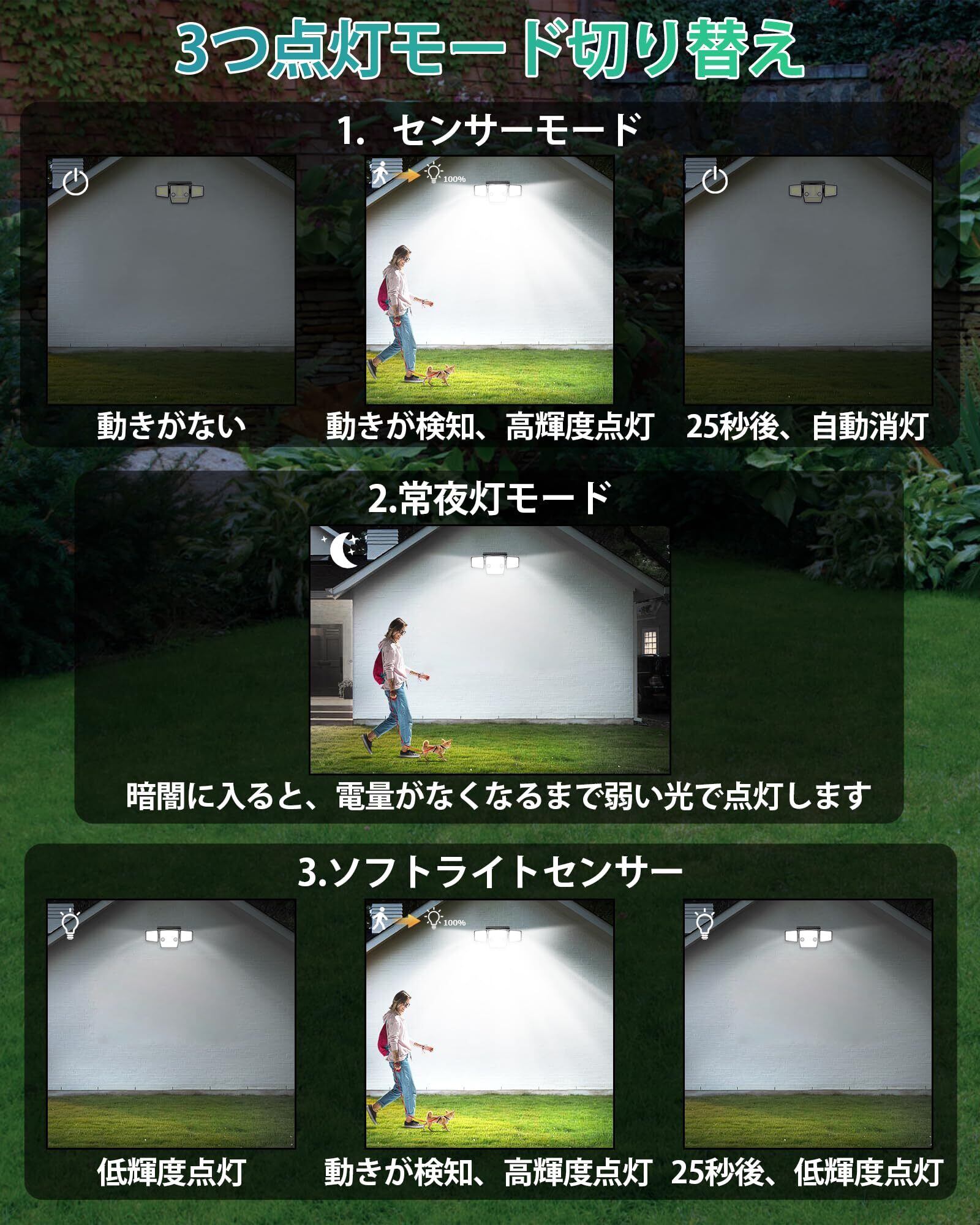【三つのセンサーモード】屋外用ソーラーライト背面のボタンを短押してモード切り替えます。「センサーモード」闇になっても点灯なし。動きを感じされると強い光になり、25秒後、消灯状態になります。「常時点灯モード」暗闇に入ると、電量がなくなるまで弱い光で点灯します。「DIMモード」闇に入ると弱い光で点灯します。動きを感じされると強い光になり、25秒後、弱い光に戻ります。玄関先に設置しておけば、帰宅時や来客時にも、暗い足元や手元を照らしてくれるので、夜間でも安心です。