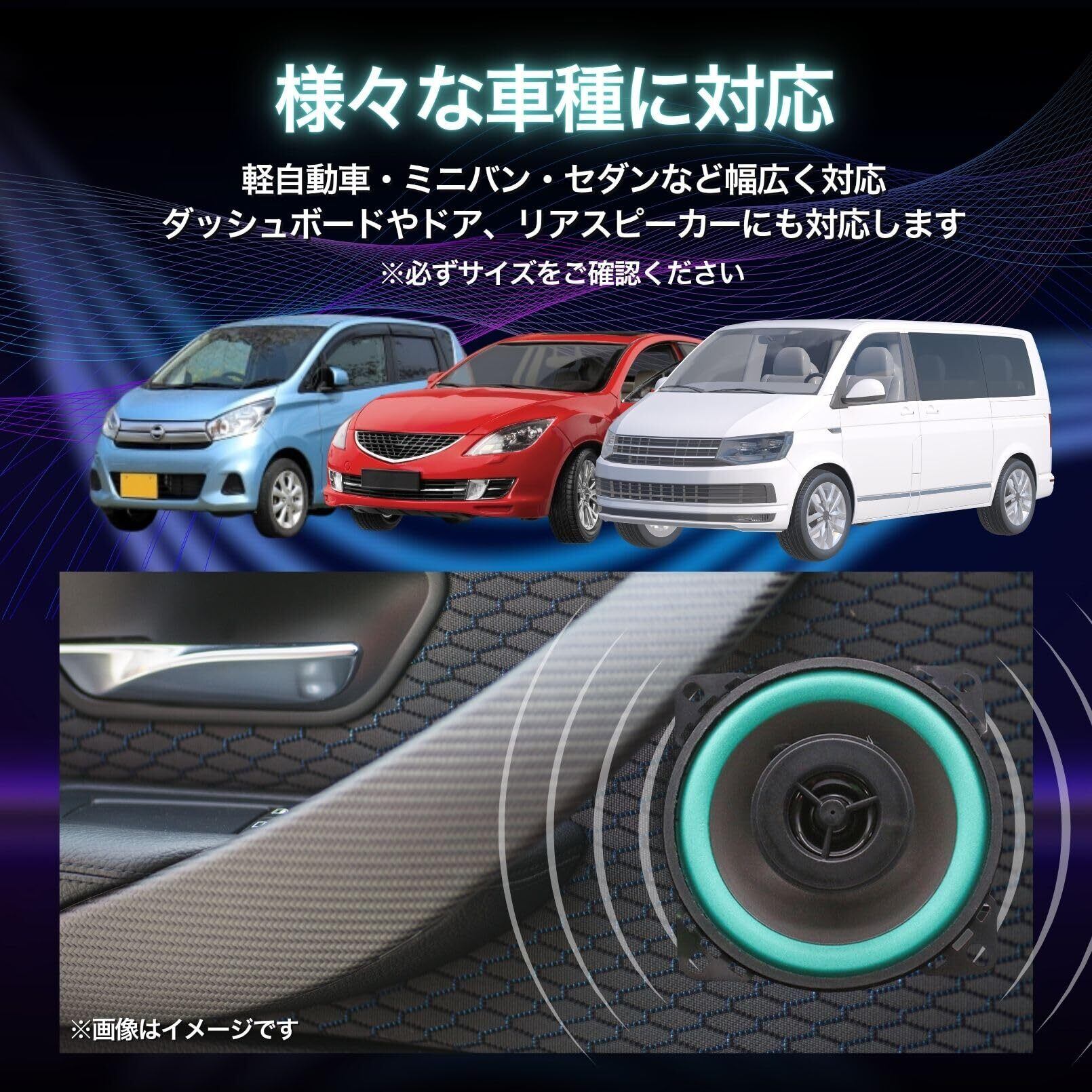 【優れた音響性能】周波数特性90Hz~20,000Hz、インピーダンス4Ωで、幅広いジャンルの音楽に対応。臨場感あふれる車内空間を実現。