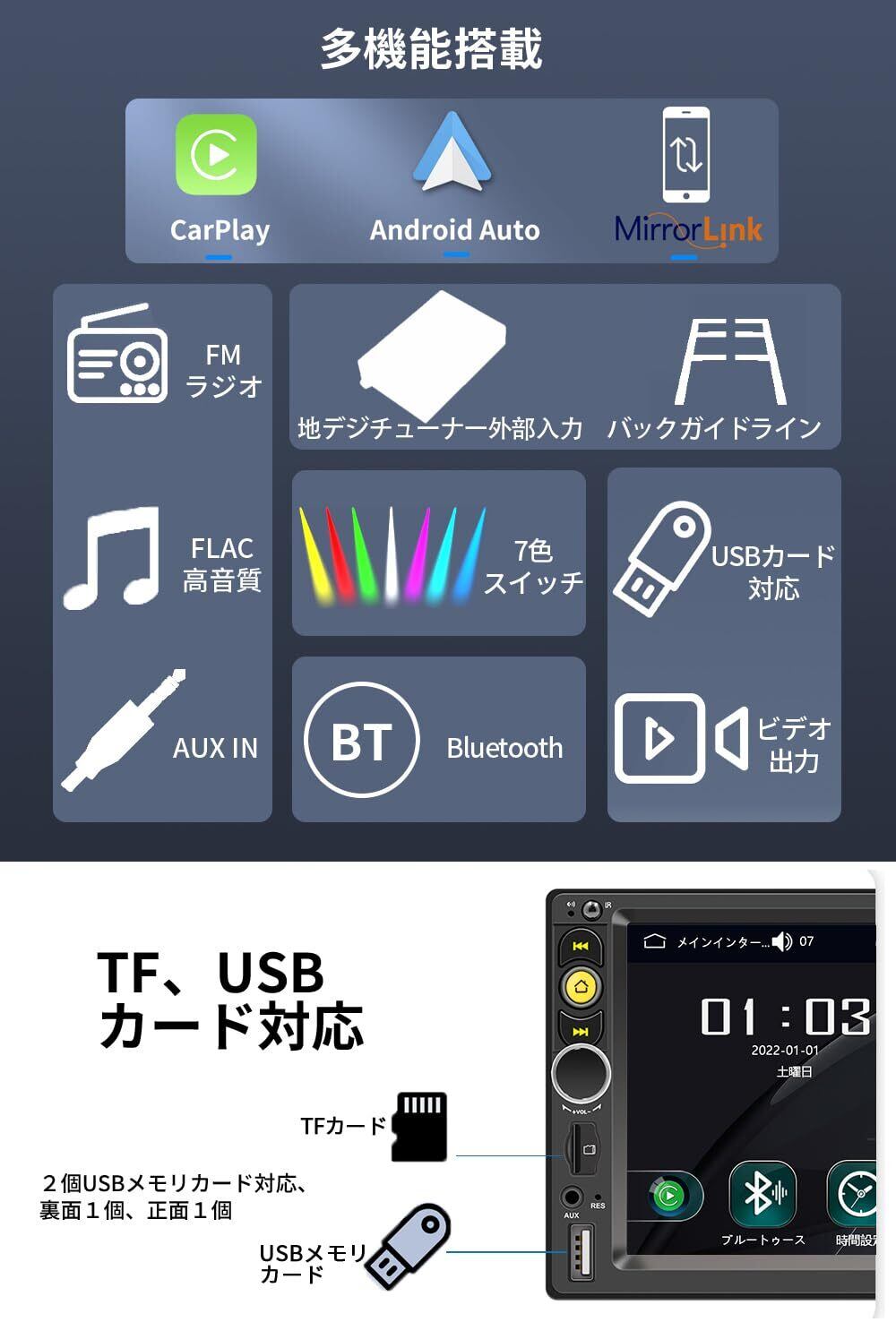 【その他の基本機能】一般的なカーオーディオに期待できるほとんどすべての重要な機能があります。(1)互換性のあるユニバーサルダブルDINサイズ(2)BluetoothハンズフリーおよびA2DP音楽ストリーミング(3)USBカードメディア再生をサポートします。(4)バックカメラ連動、AUX接続など(5)日本語説明書を付属しています。何か問題があったらお気軽にお問い合わせください。 ※本商品スペックがないので、アプリのダウンロードできかねます。。GPSアンテナはご利用できかねます。