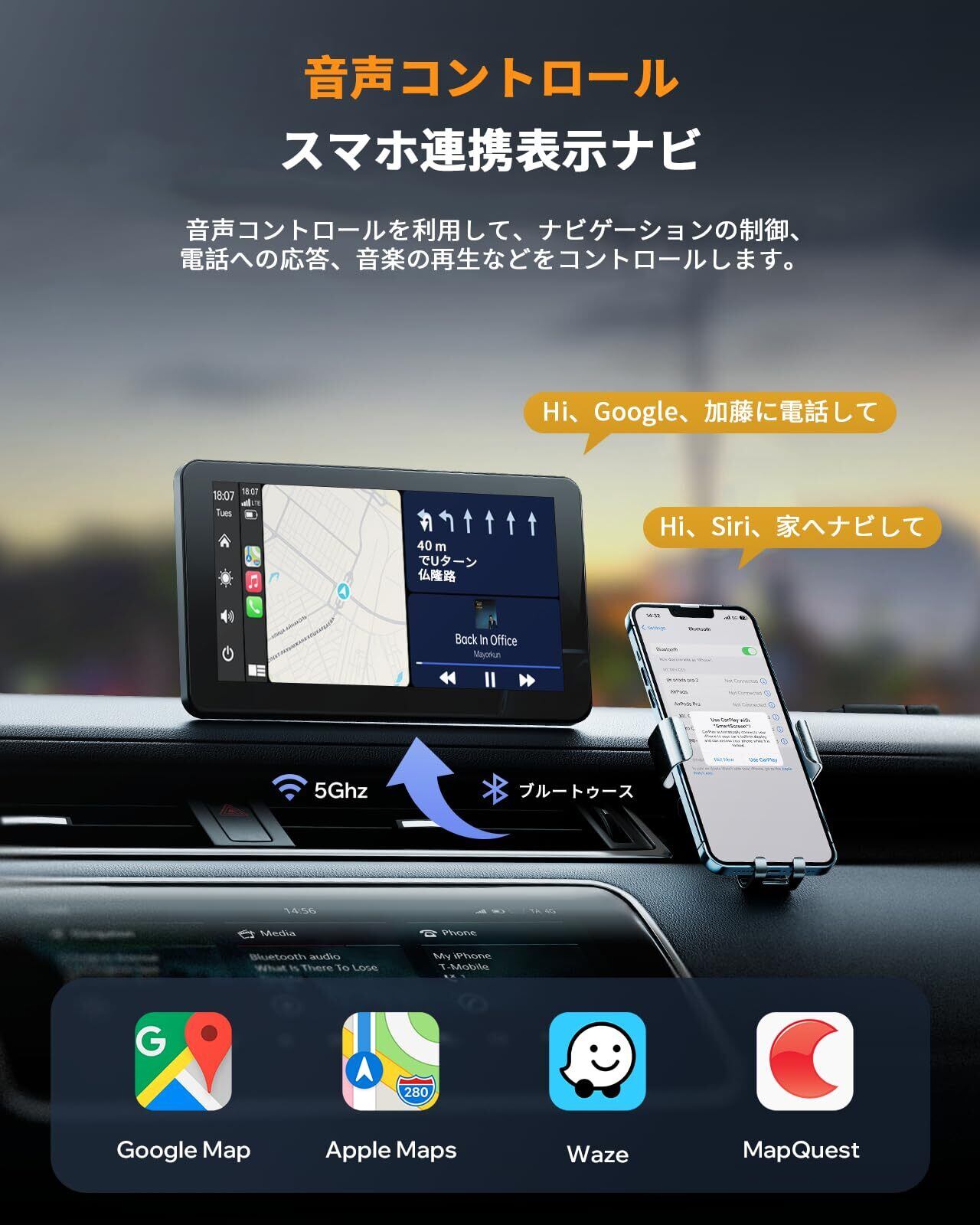 【Siri/Google音声コントロール】Bluetooth 5.0ハンズフリーシステムと内蔵のクリアマイクにより、運転中に電話に出られ、携帯電話を持ち続ける必要がなくなり、音声制御をサポートすることで、前方の道路を常に注視し、目的地に安全に到着できるようになります。