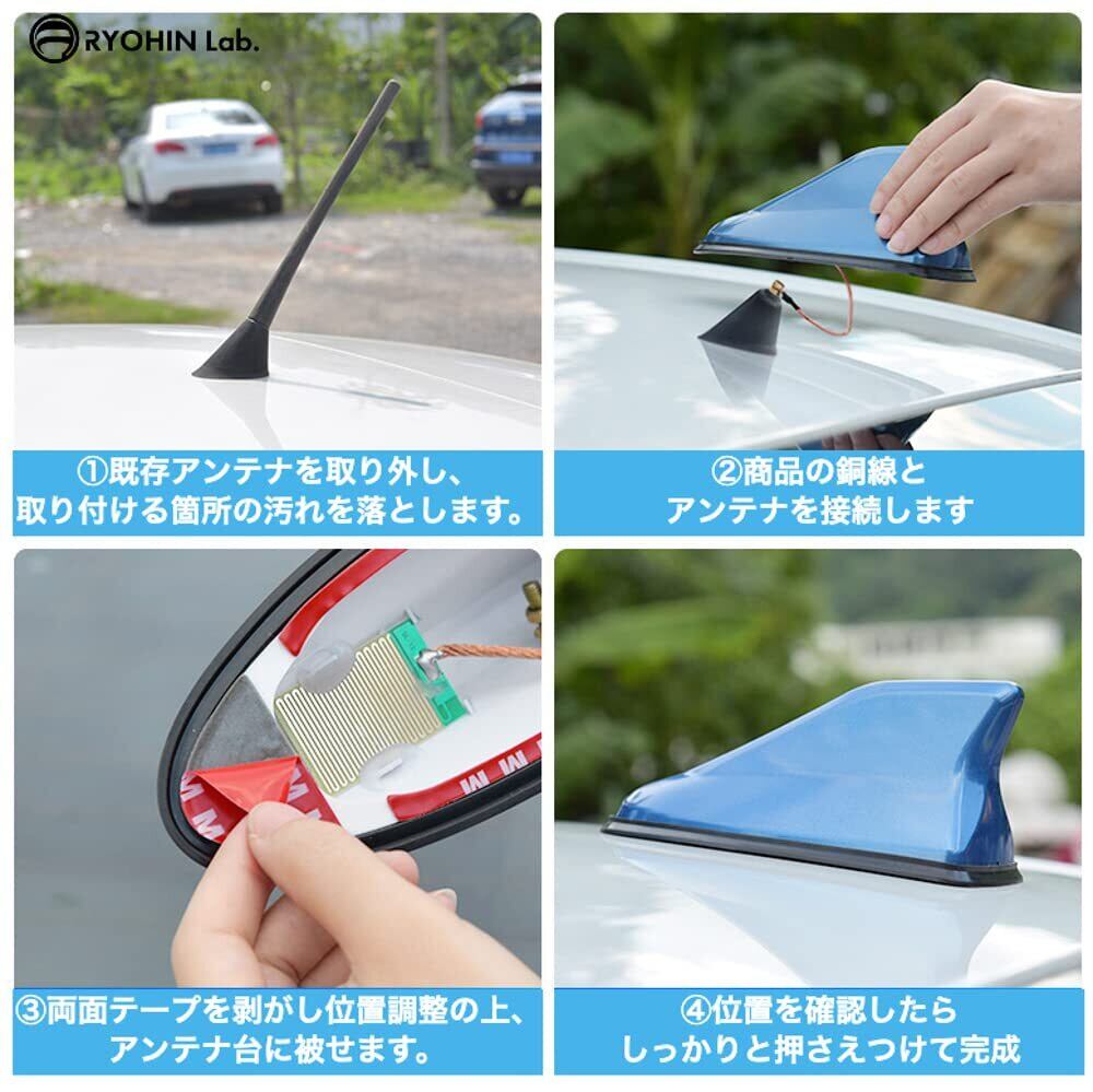 【簡単取り付け】①既存アンテナを取り外し、取り付ける箇所の汚れを落とします。 ②ネジでアンテナ線を取り付けます。 ③両面テープを剥がし位置調整の上、アンテナ台に被せます。 ④位置を確認したらしっかりと押さえつけて完成です。 ※取り付けした後、24時間は洗車をお控えください。万が一パッキンに不備がある場合はポリシーに準じて返品対応致します。