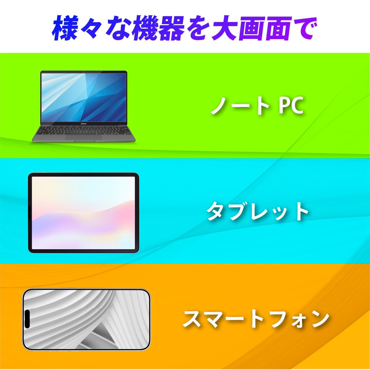 様々な機器に対応。スマホ/タブレットはもちろんノートPCなどにも対応。TV/モニター/プロジェクター/カーナビなどに出力可能です。